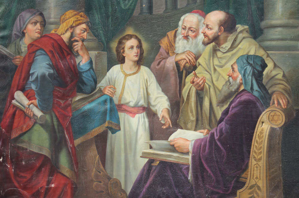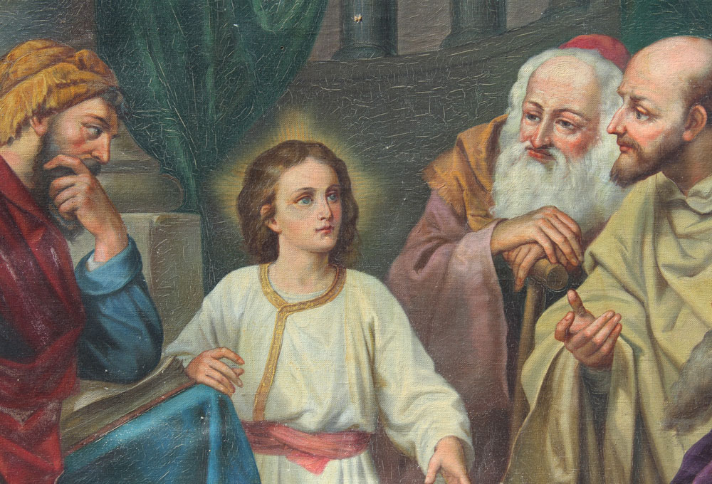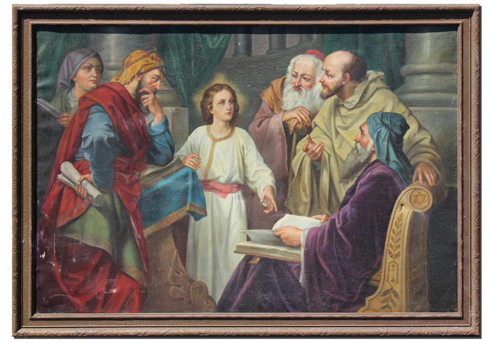 'DETAILED RELIGIOUS PAINTING WITH CHRIST & APOSTLES'': Oil/Canvas, 20'' x 30'', no visible signature, frame w/wear, 22 1/2'' x 32 1/2''.