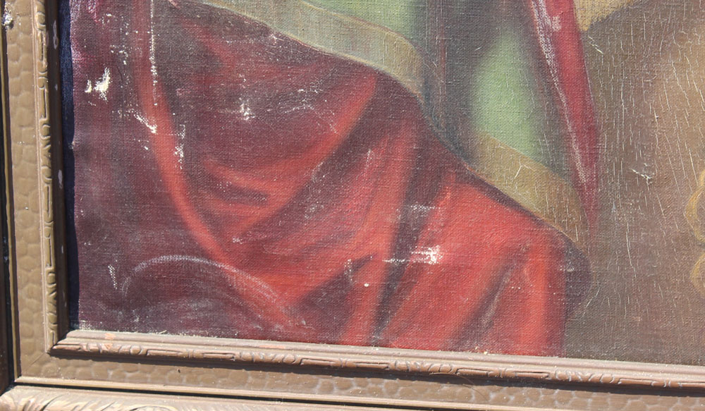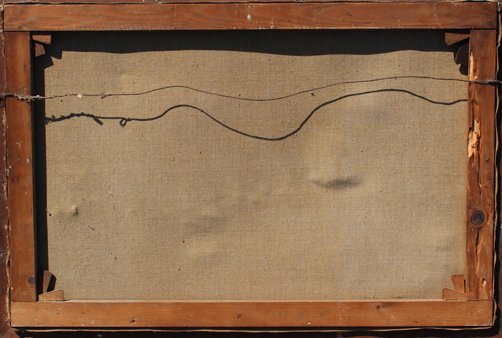CONDITION: Several depressions, abrasions lower left corner, craquelure throughout, needs cleaning, termite damage to stretcher, been treated.