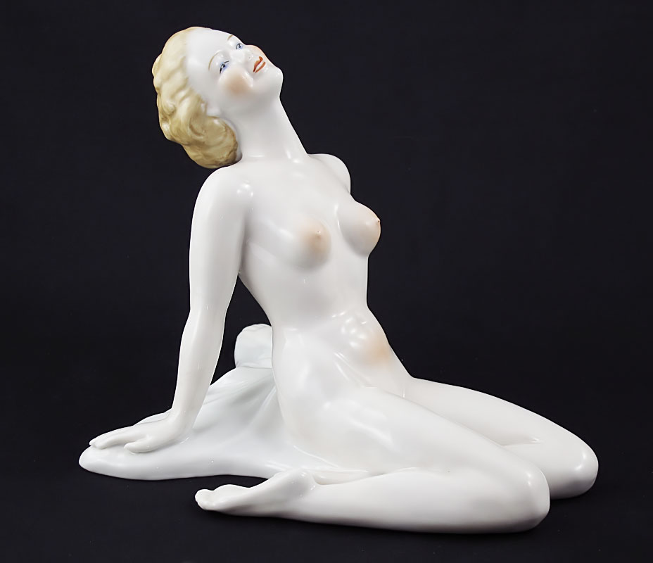 GERMAN NEUNDORF PORCELAIN NUDE FIGURE: 7'' x 7 1/2'' x 5''.