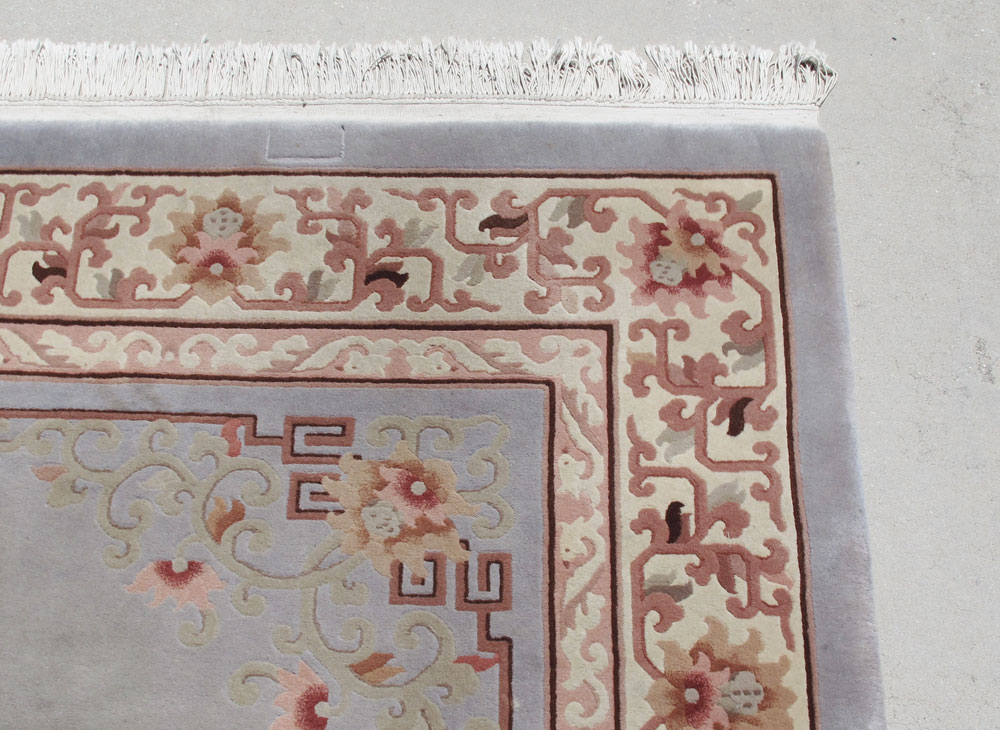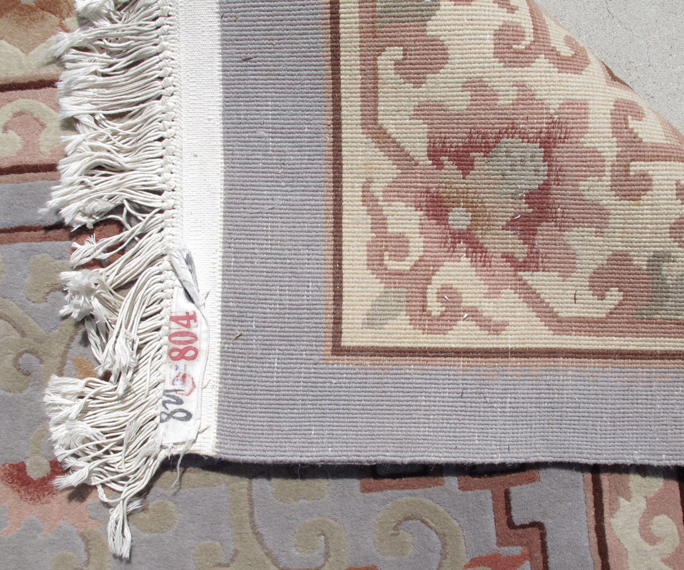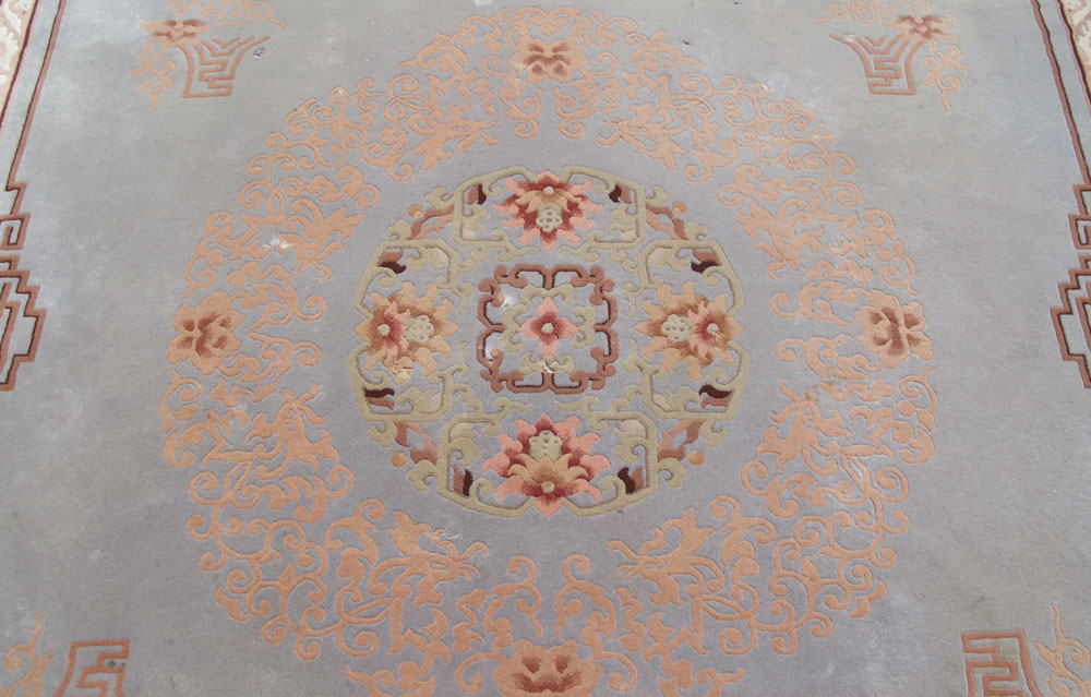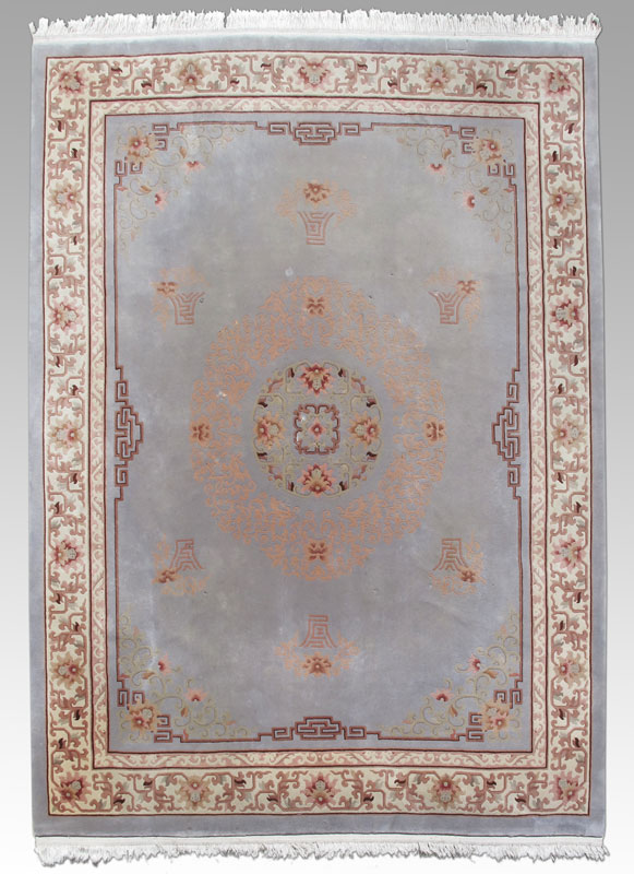 MODERN CHINESE HAND KNOTTED WOOL RUG, 12' x 9'11'': This room size rug has a soft grey field with a round Oriental motifs medallion within a larger soft pink medallion. The field has small Oriental motifs and flowers placed here and there using the same soft pink and ivory. The main border has an ivory field with brown, beige and pink flowers in a tracery design.