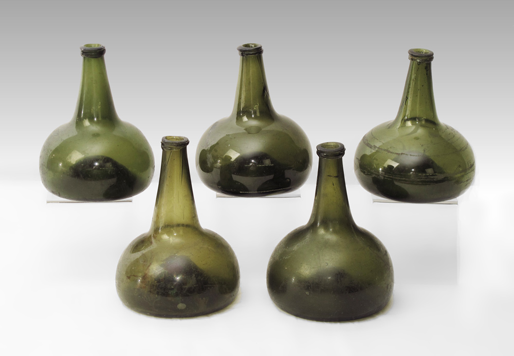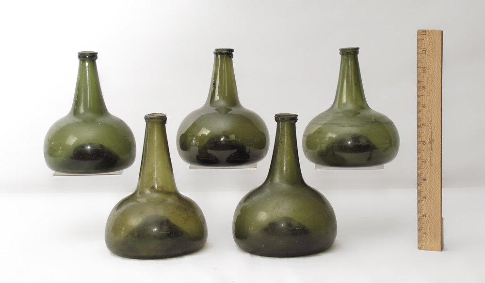 FIVE 18TH CENTURY GREEN DUTCH ONION BOTTLES: Largest measures 7 5/8'' x 5 3/4''.