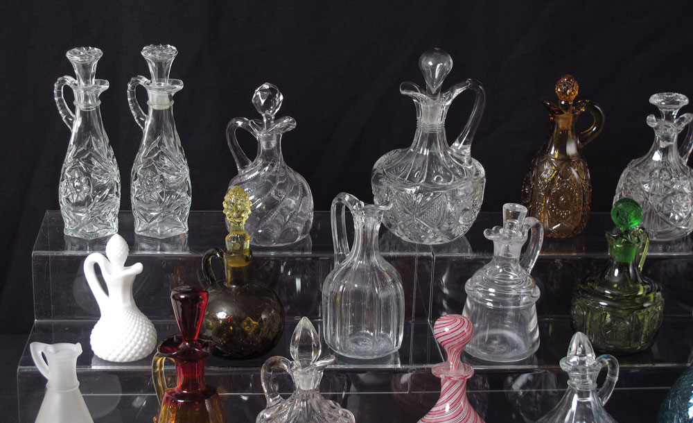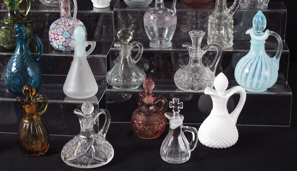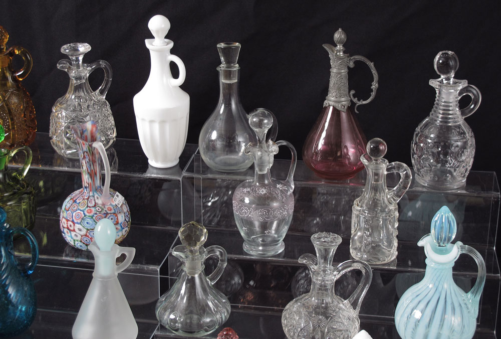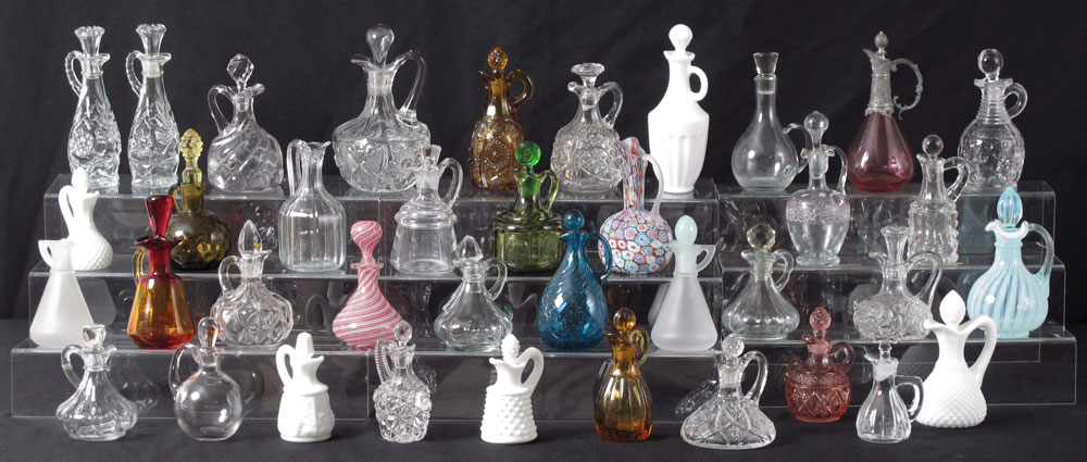 38 pc COLLECTION GLASS CRUETS: To include millefiori, cranberry, opalescent, coin pattern, amberina, New England glass, Heisey, milk glass.