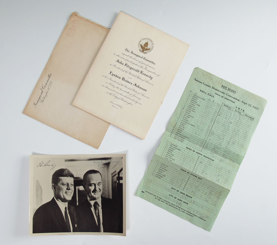 JOHN KENNEDY INAUGURAL INVITATION & SIGNED PHOTO: To include 1) Signed 8 x 10 photograph of John Kennedy and Lyndon B. Johnson. 2) Inaugural Committee invitation to the Inauguration of Kennedy & Johnson. 3) 1953 Nassau County Democratic Convention Box Score, Towns of Hepstead, Oyster Bay, Long Beach, and Glen Cove
