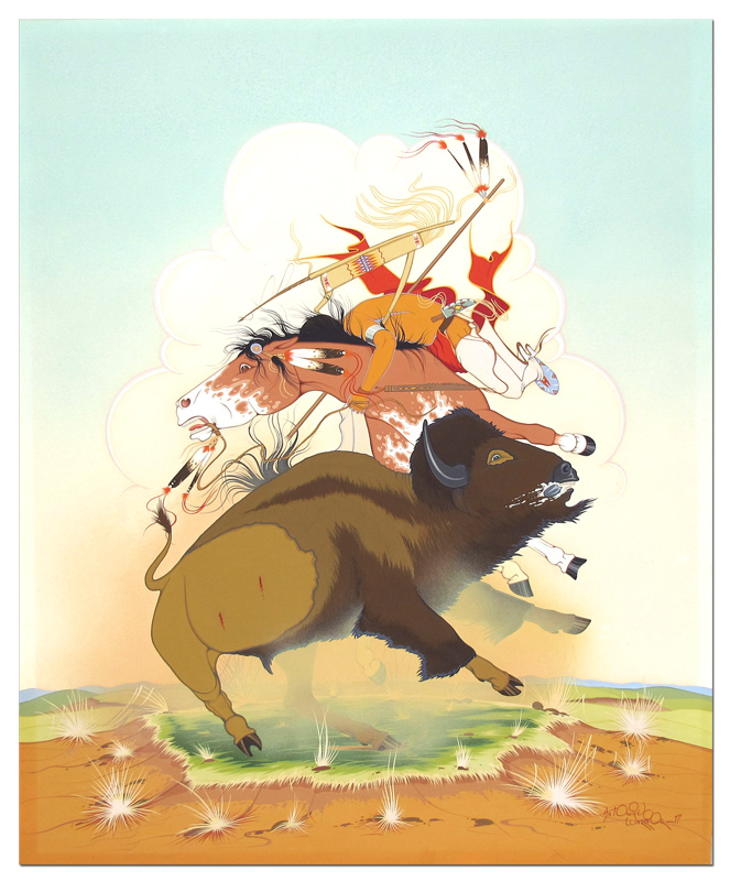 WARRIOR, Antowine, (American, 20th Century): Buffalo Charging Indian Warrior on Horseback, watercolor and gouache, 26'' x 21'', signed lower right, dated '77, unframed.