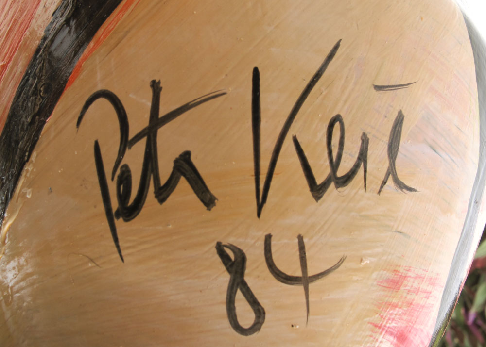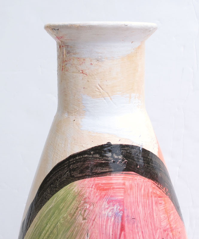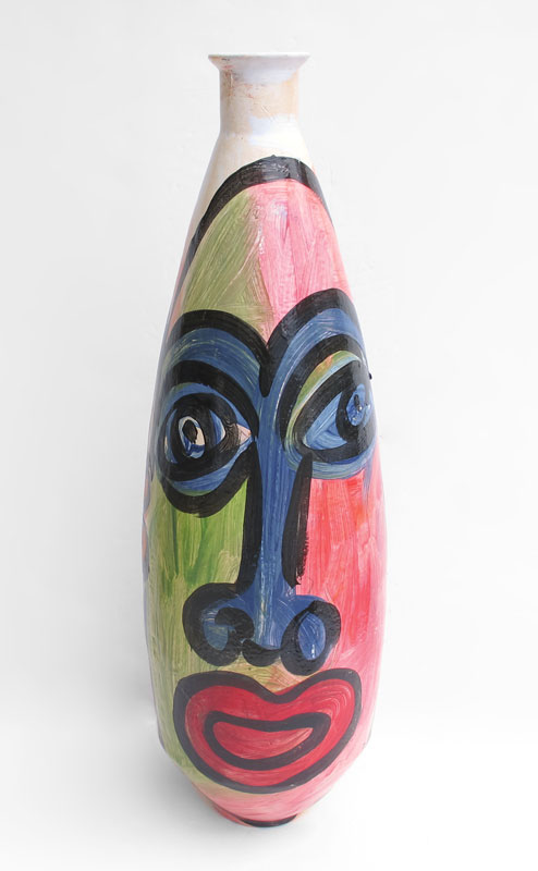 PETER KEIL PAINTED GLASS VASE: 2 heads in typical Peter Keil style. Signed and dated '84. 31 1/2'' tall x 10'' dia.