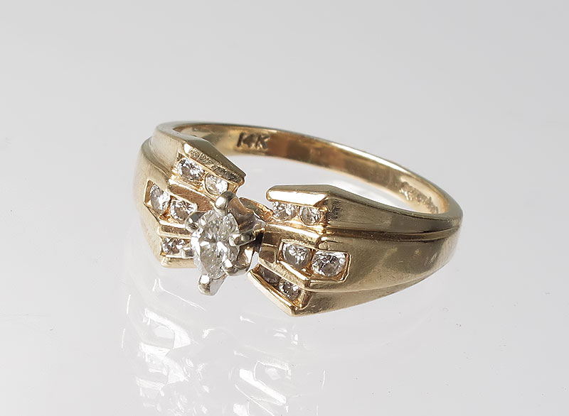 MARQUIS DIAMOND ENGAGEMENT RING: 14K yellow gold ring centers one marquise diamond and 12 round full cut diamonds, all totaling approx. .33 Ct., averaging SI in clarity and H-I color. Prong set. Weight 3.5 grams. Size 7.