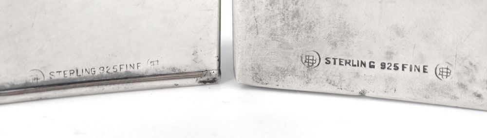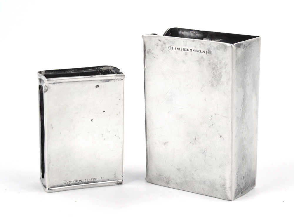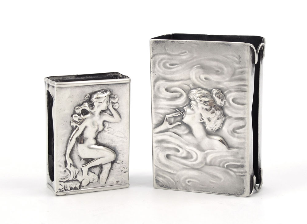2 UNGER BROTHERS ART NOUVEAU STERLING MATCH BOX HOLDERS: To include 1) Figure of woman smoking with wisps of smoke surrounding. 2 1/4'' x 2 1/2'' x 3/4''. 2) Figure of full nude woman, 1 3/4'' x 1 1/4'' x 1/2''. Approx. 1.1 troy oz.