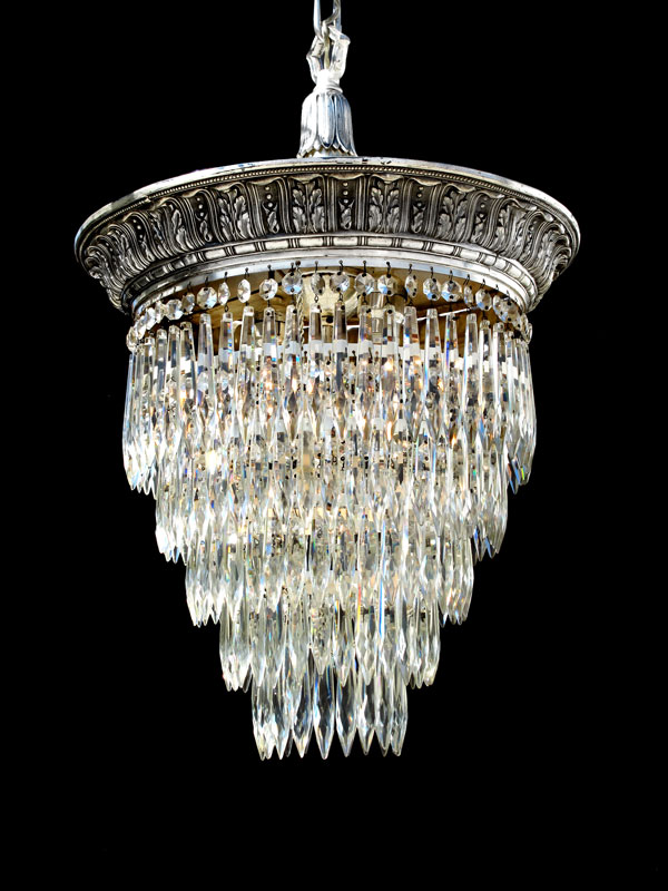 ART DECO CRYSTAL CHANDELIER: Five tiers of crystal prisms hang from an embossed silvered ring, matching ceiling cap (please pick up from office). Approx. 15'' length.