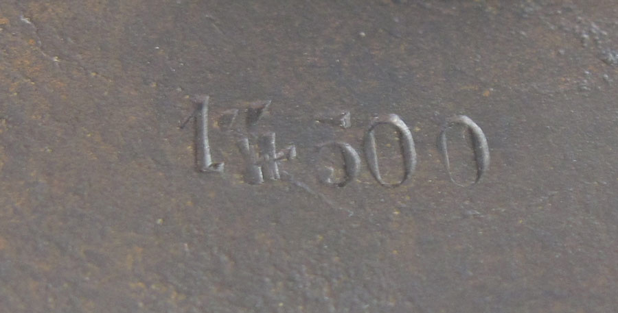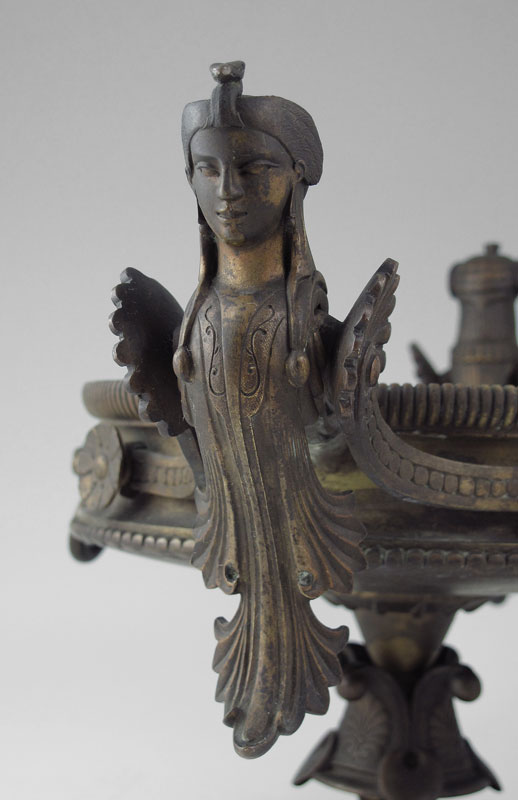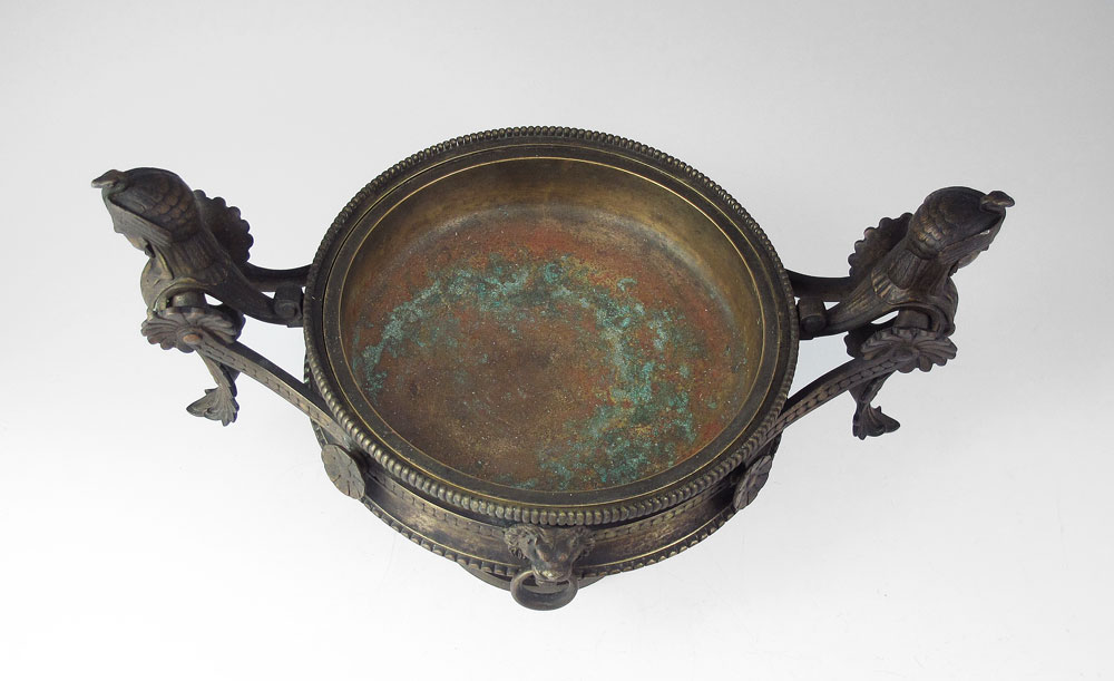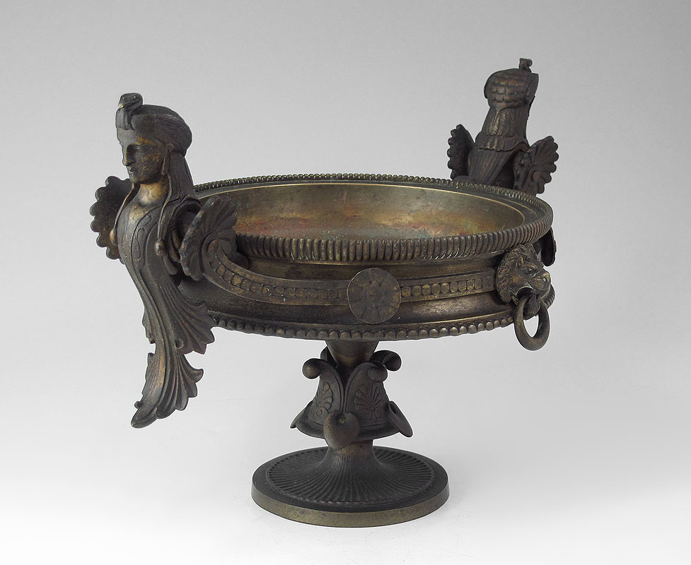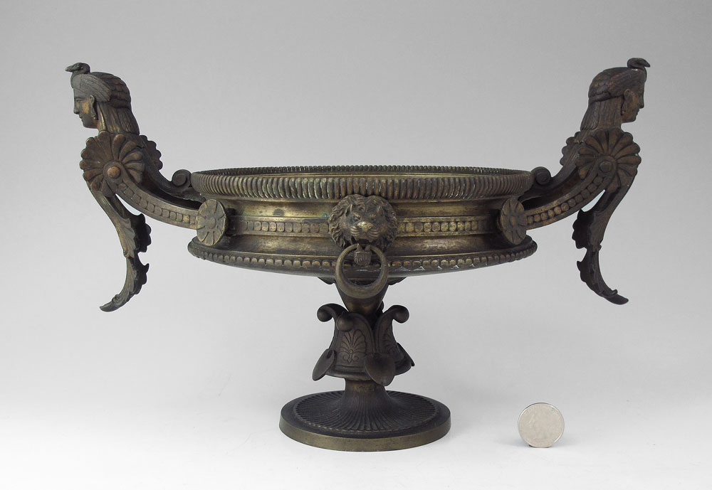 EGYPTIAN REVIVAL BRONZE TAZZA: Figural bust handles with applied lion head masquerons on formed base. Stamped on base with unknown makers hallmark and 500. Measures 8 1/4'' h. x 13 3/4''.