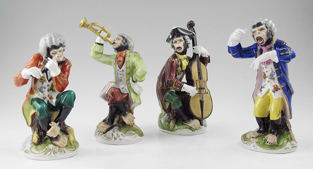 4 PIECE DRESDEN PORCELAIN MONKEY BAND: Sandizell Porcelain Factory. The Conductor 693, Flute player 695, Trumpet player 696, and Cello 697. Dresden Crown N mark. Approx. 6 - 7'' tall.