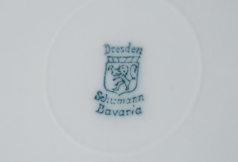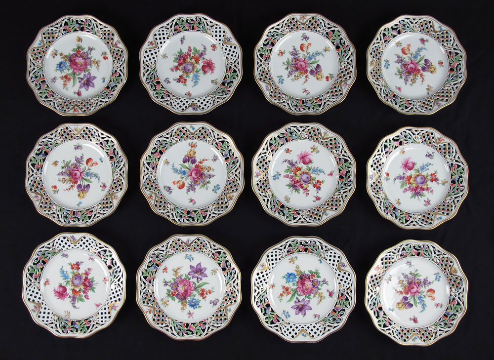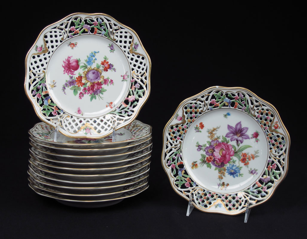 SET OF 12 SCHUMANN DRESDEN RETICULATED PLATES: Reticulated borders centering floral center. 8.5'' dia.