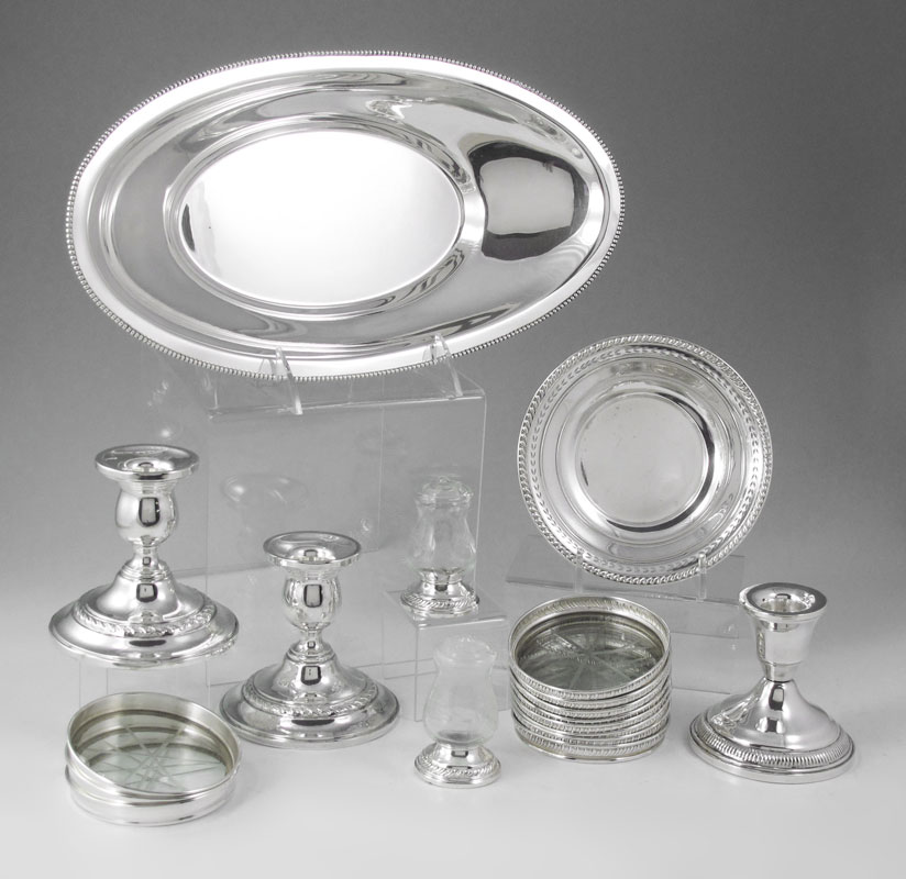 ESTATE STERLING SILVER COLLECTION: Approx. 18 pieces to include 1) Hunt Silver vegetable, 2 1/4'' h. x 12 5/8'' x 6 3/4''. 2) Watson bowl with reticulated rim, 5 1/2'' dia. 3) Pair Preisner weighted candle stands, 3 3/4'' h. 4) Unmarked as to maker candle stand, note damage, 3 1/8'' h. 5) 11 sterling mounted coasters in 2 patterns, 3 1/8'' dia. 6) Pair Quaker weighted sterling base cut glass salts, 2 3/4'' h.. Approx. 10.9 troy oz. weighable sterling.
