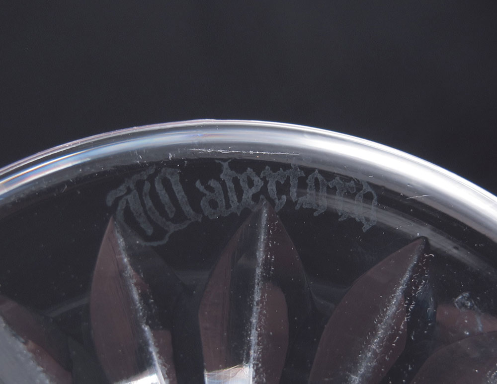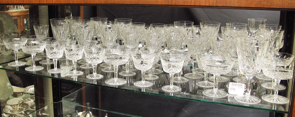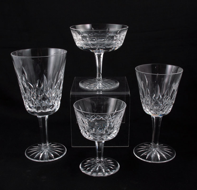WATERFORD CRYSTAL IN THE LISMORE PATTERN: Approx. 39 pieces to include 8 water goblets (6 3/4''), 8 champagne sherbets (4 1/8'') one very tiny rim chip, 11 wine (5 3/4''), 12 wine (4'').
