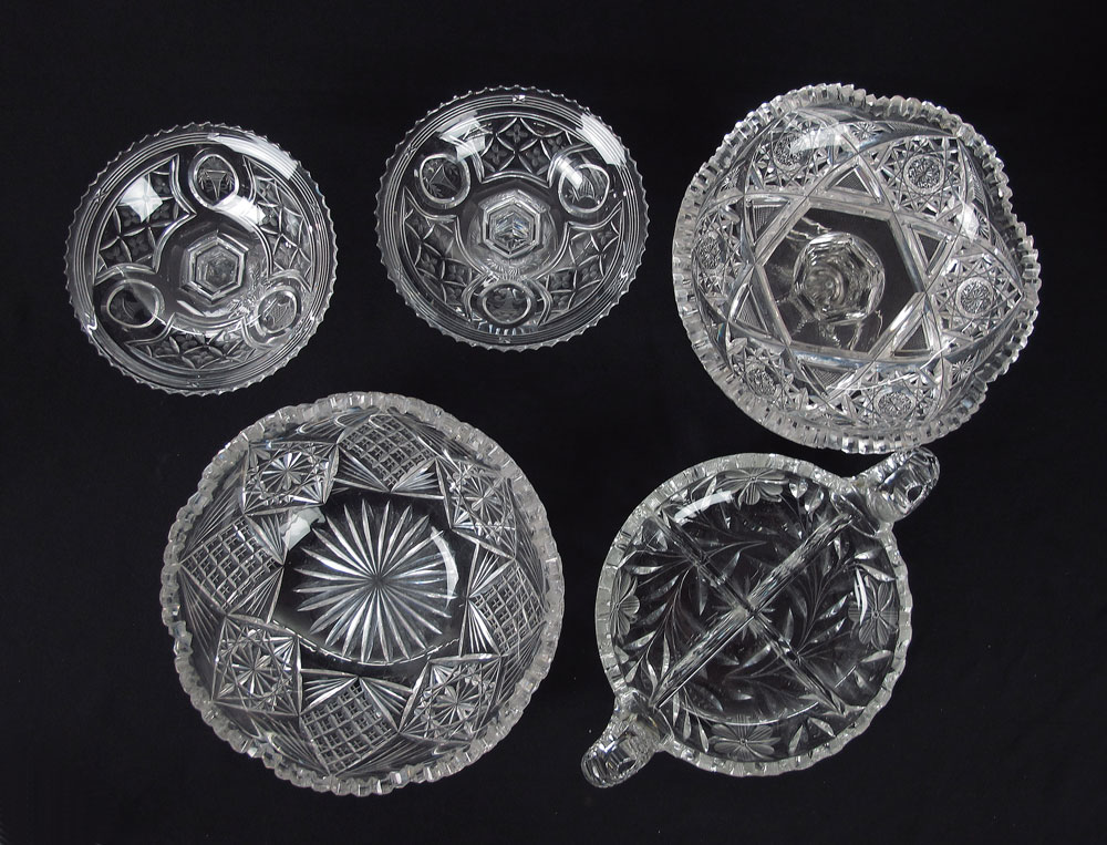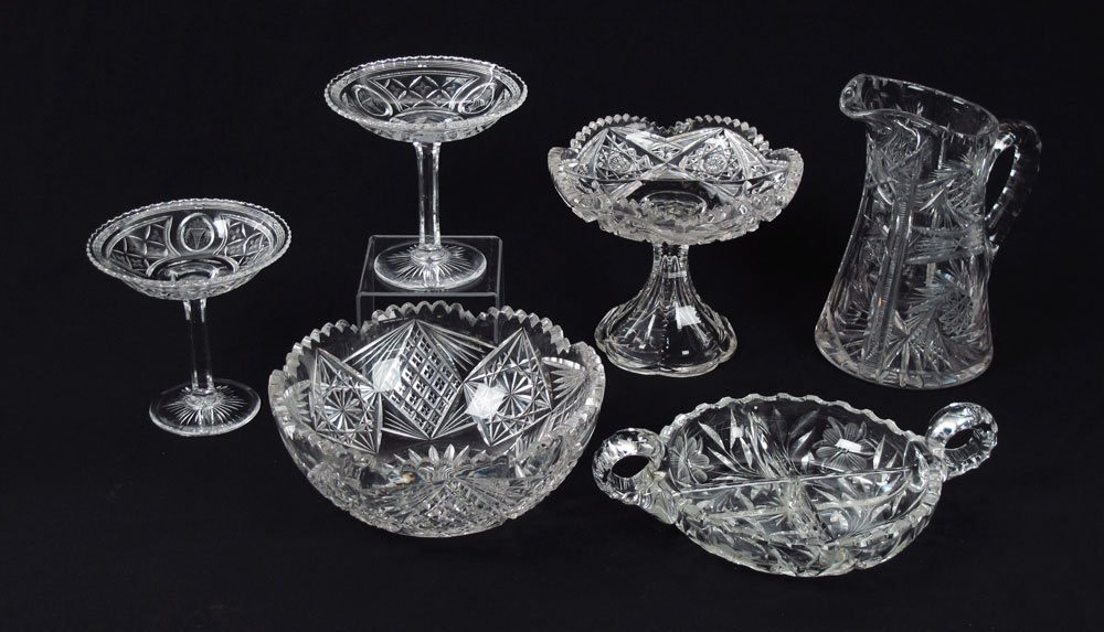 AMERICAN BRILLIANT CUT GLASS: 6 piece group to include a matching pair of compotes (6''h.), a four part divided dish with large rolled handles, a 10'' water pitcher, a 9 1/2'' dia. berry bowl and a compote, 8''h. x 7'' dia.