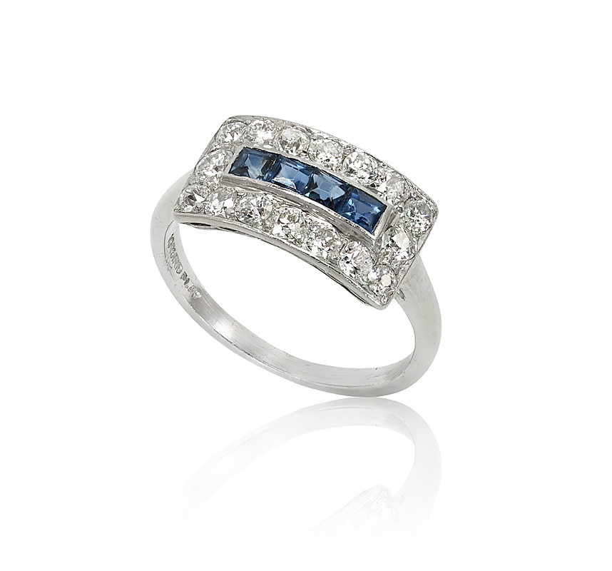 PLATINUM ART DECO SAPPHIRE DIAMOND DECK RING: The deck centers a row of 4 channel set square calibrated sapphires, totaling approx. .60 Ct. Framed by 16 old European round cut diamonds, all totaling approx. 1.00 Ct., VS in clarity and G-H in color. Diamonds are bead set. Size 8. Weight 4.3 grams. Sold with current Atlanta Gemological GIA graduates appraisal for $4,000