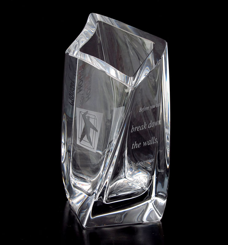KOSTA BODA CRYSTAL MOTTO VASE: ''Before you can break down the walls first determine where they are''. Approx. 9'' x 5''.
