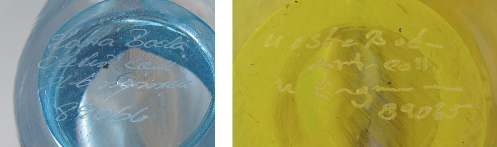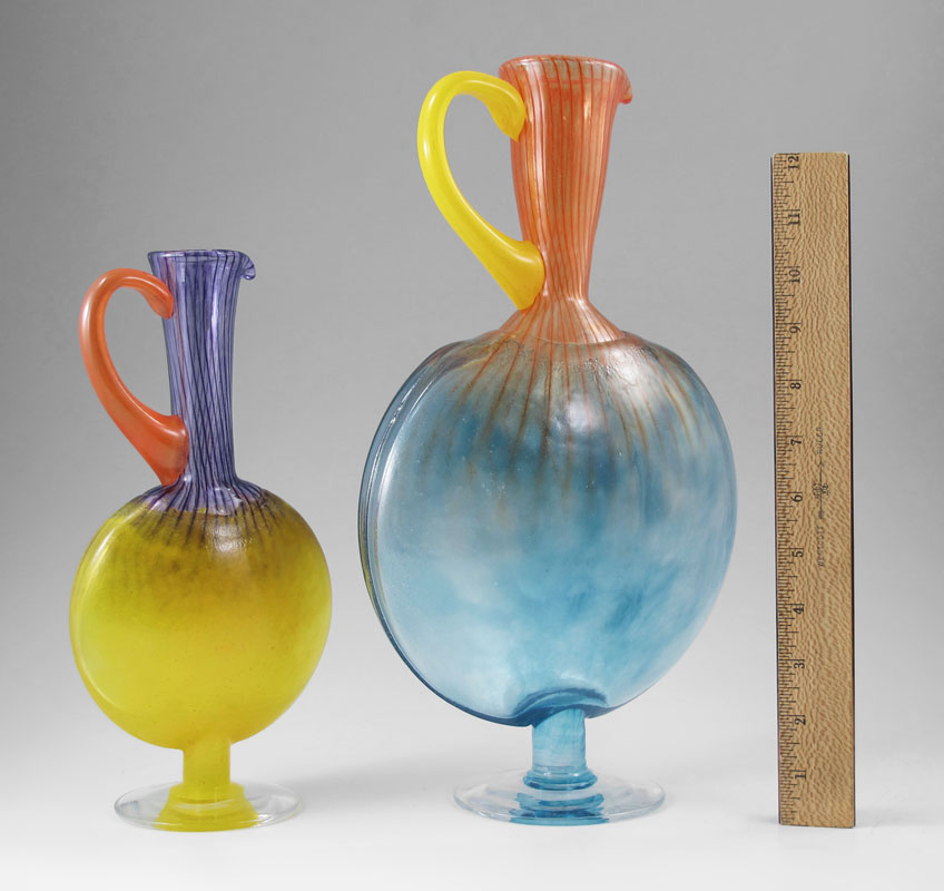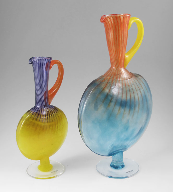 2 SIGNED AND #'D KOSTA BODA EWERS: 14''h. Aqua, orange and yellow, with label, signed and #'d 89066, tiny chip to edge of puffed body, approx. 8'' x 4''; and 10 1/2''h. Yellow, purple and orange, with label, signed and #'d 89065, body approx. 5 1/2'' x 2 1/2''.