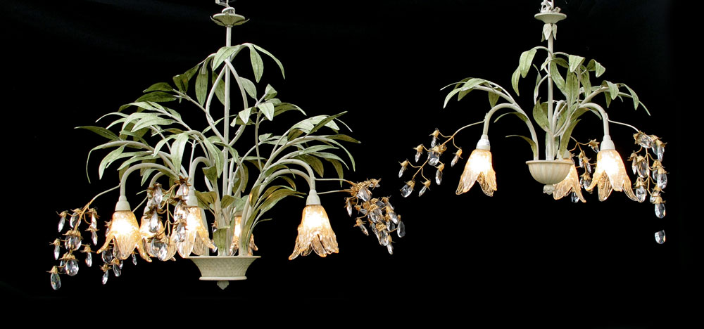 2 ART METAL AND CRYSTAL FLORAL MOTIF CHANDELIERS: A matched set of chandeliers possibly for your dining room and entryway. The larger is a 6 light measuring approx. 30''dia x 25 1/2'' plus a small amount of chain and the smaller version has 3 lights and measures approx. 23'' triangularly x 17'' plus many feet in chain. Sold as a lot.