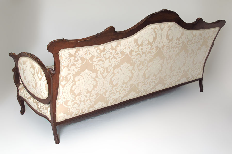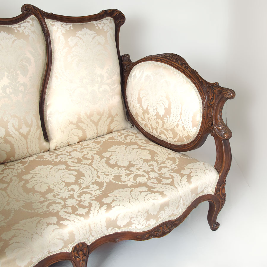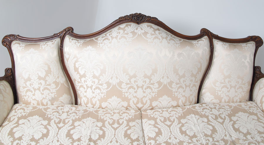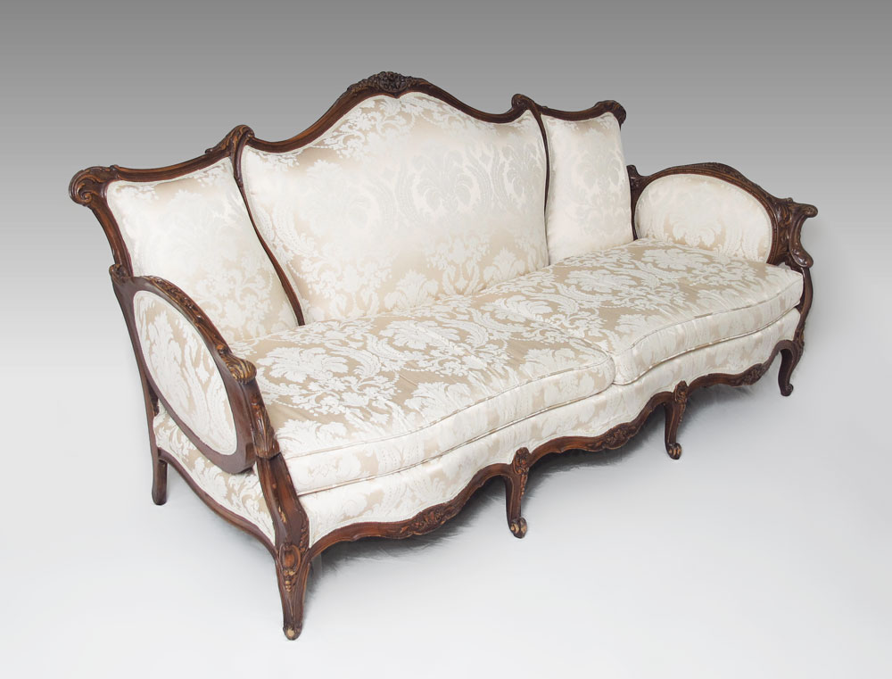 FRENCH STYLE CARVED SOFA: Carved and shaped top rail with floral and foliate motifs, shaped and padded armrests, carved and shaped skirt, 6 legs. Ivory foliate motif upholstery. 40 1/4'' h. x 77 1/4'' x 37''