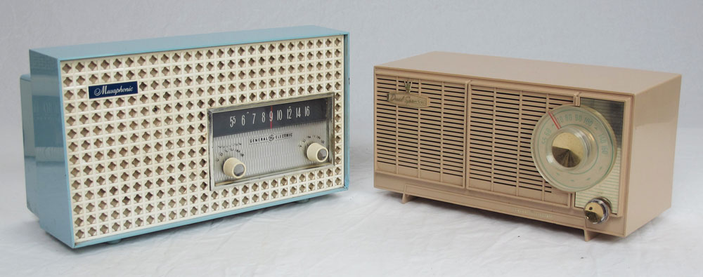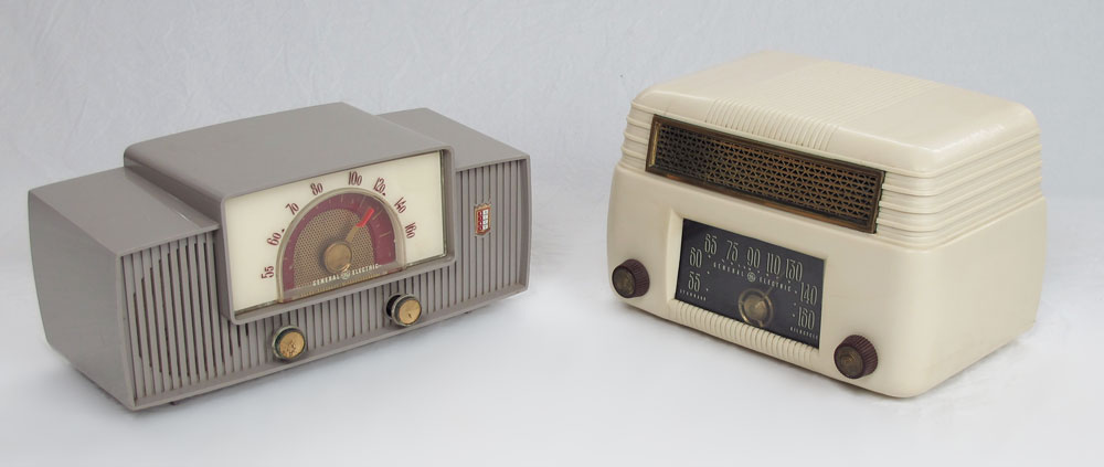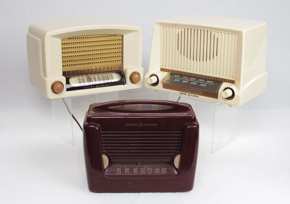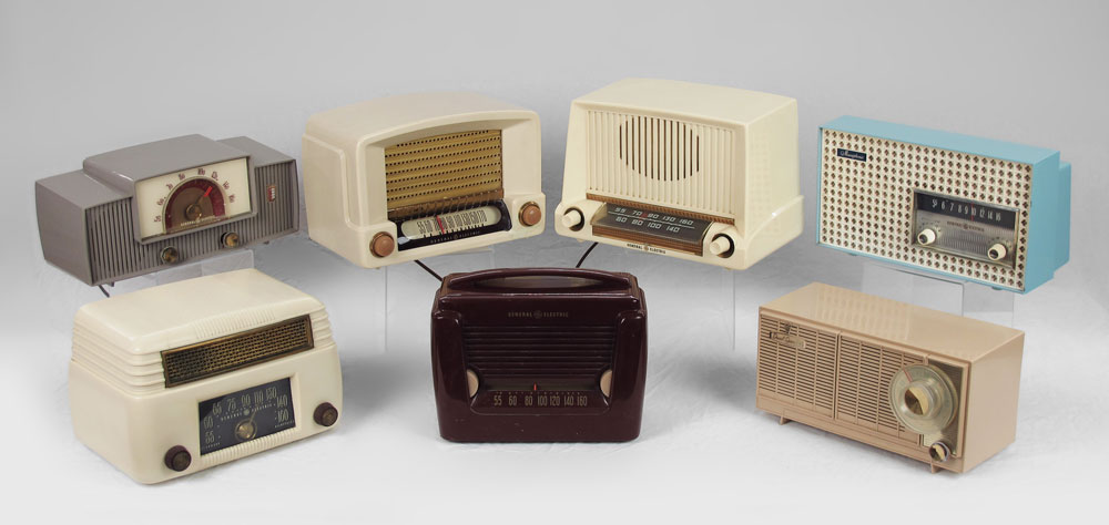 COLLECTION OF VINTAGE GE GENERAL ELECTRIC RADIOS: 7 Piece, 600, 201, 115W, 405, 467, 5202 ''Musaphonic'', and unknown. Largest measures 9'' x 13'' x 8''.