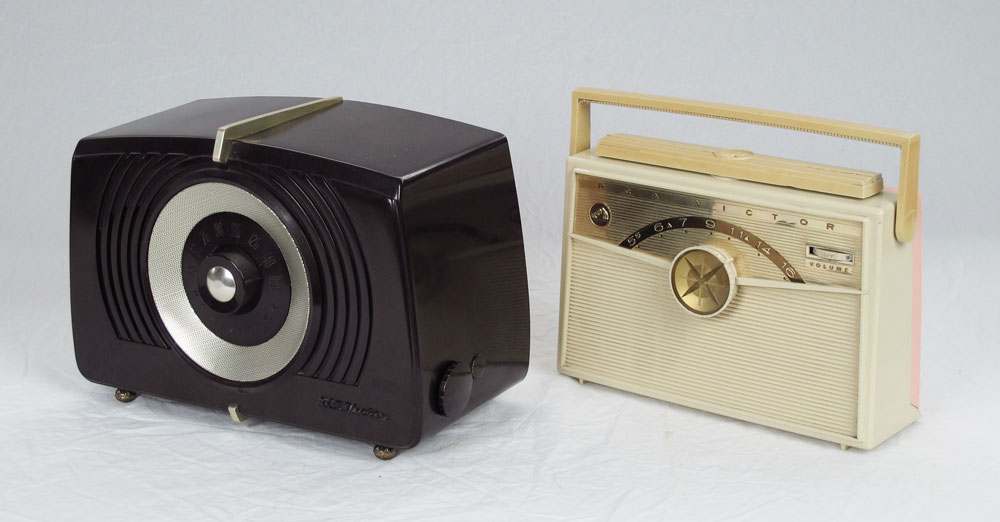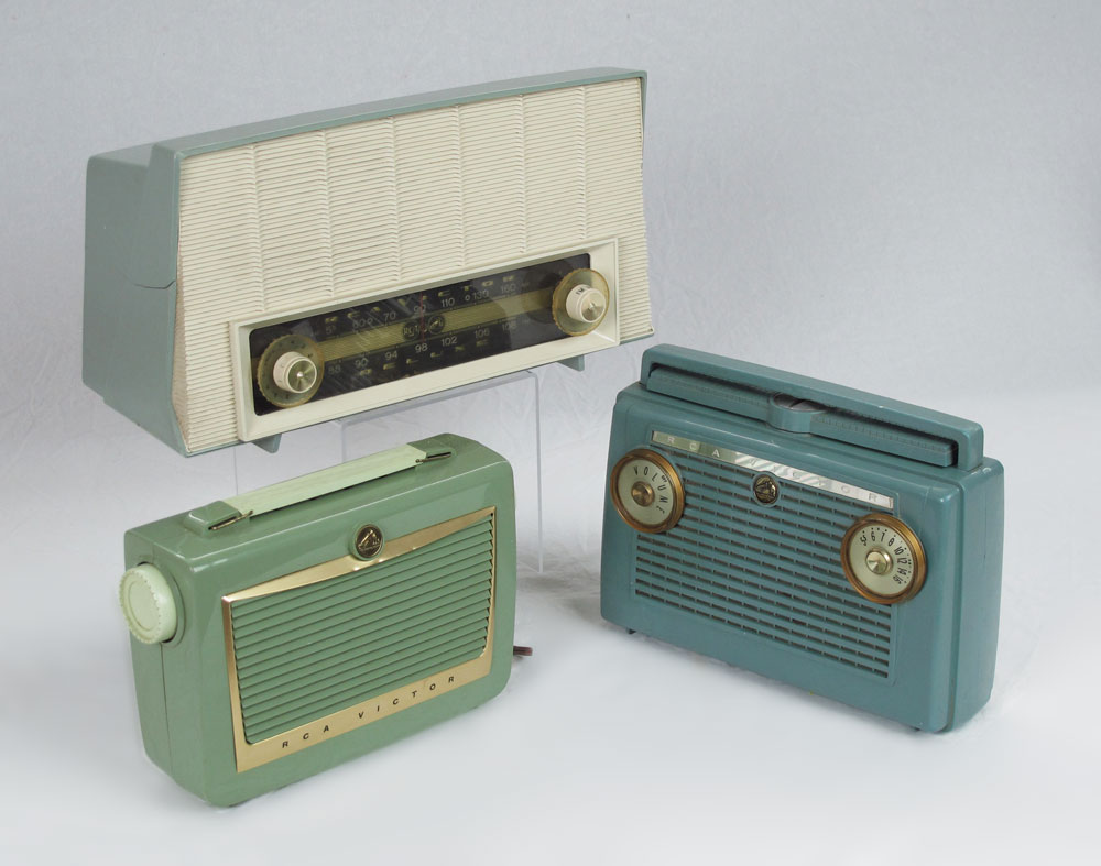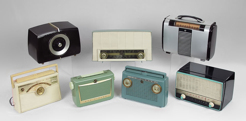 COLLECTION OF VINTAGE RCA VICTOR RADIOS: 7 Piece: 8BXG, 4551, 8X9D, 6BX6B, 1BX62, 7BX6L, XF 3 EH. Largest measures 10 1/2'' x 13 1/2'' x 5 1/4''.