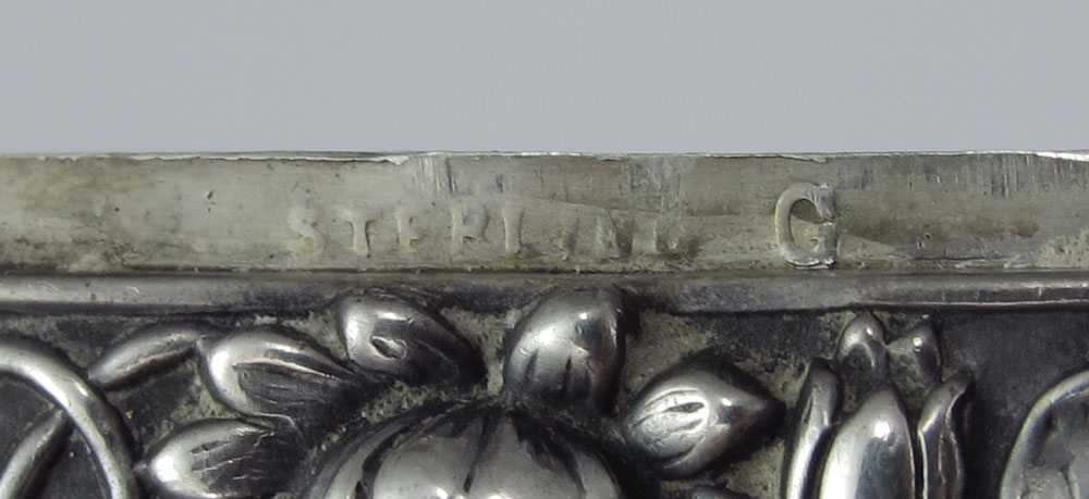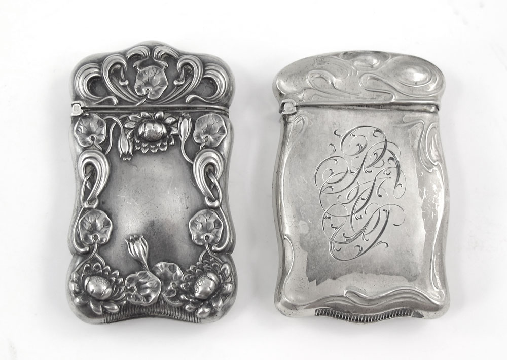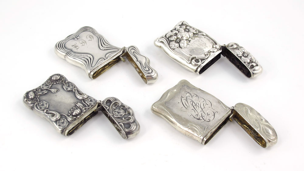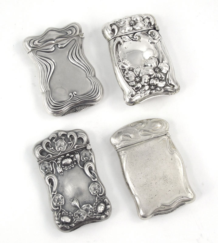 4 PIECE GILBERT STERLING ART NOUVEAU MATCH SAFES: 4 marked Sterling G, in stylized art nouveau motifs, 3 monogrammed. Largest 2 3/4''. Approx. 3.4 troy oz.