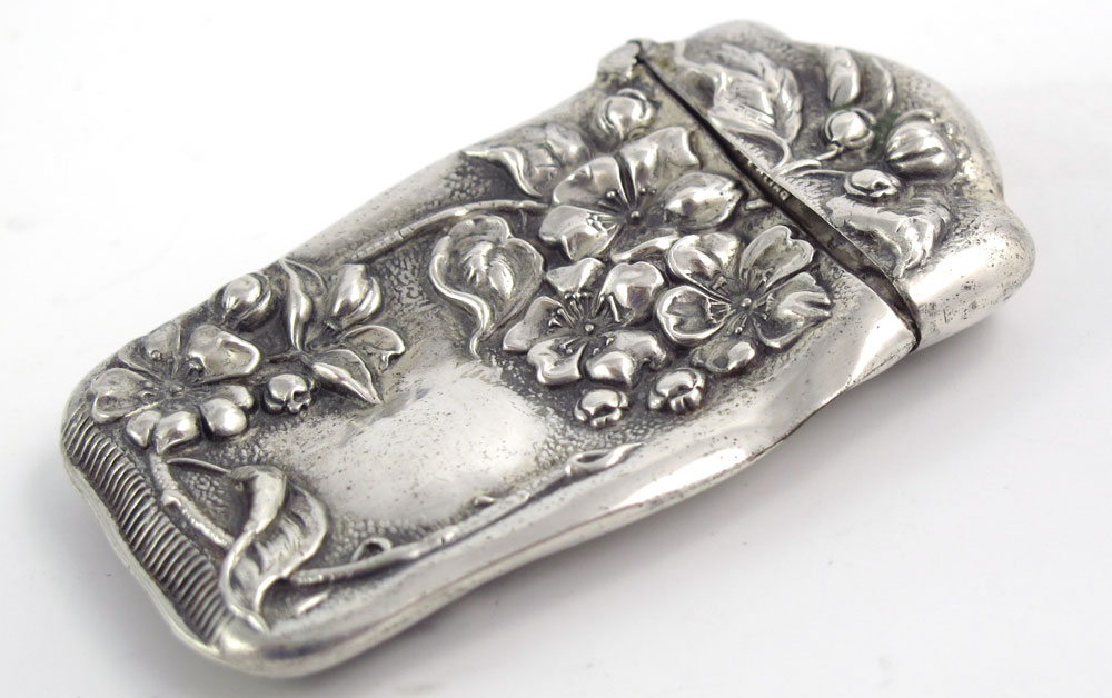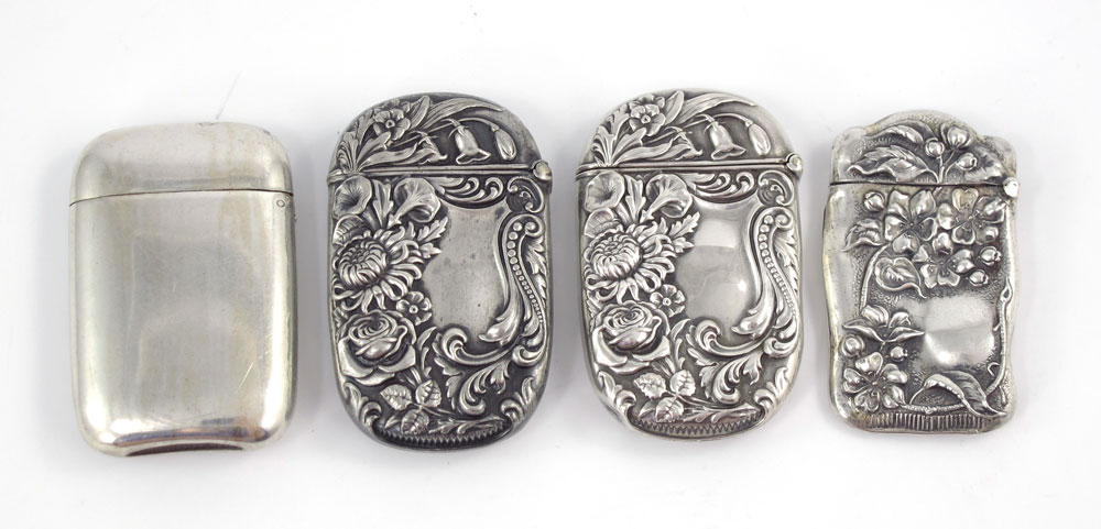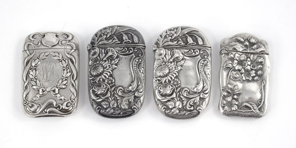 4 SIMONS BROTHERS ART NOUVEAU STERLING MATCH SAFES: 2 with matching floral and foliate motif, another with floral motif, the fourth with wreath and twist smoke motif. One monogrammed. Largest 2 1/2'' x 1 5/8''. Approx. 2.9 troy oz.