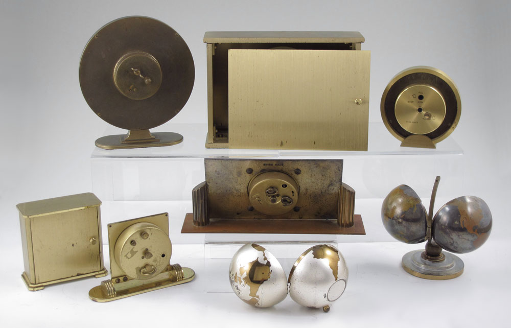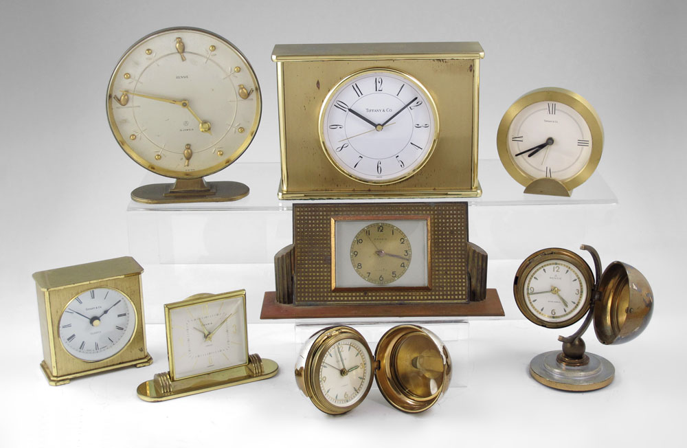 8 PIECE TIFFANY & RENSIE TRAVEL & DESK CLOCKS: To include 1) Tiffany & Co. gold toned desk clock, quartz movement. 5'' h. x 6 3/4'' x 2 3/8''. 2) Tiffany & Co. gold toned circular travel clock with leather case. Quartz movement. 3 1/2'' h. 3) Tiffany & Co. gold toned travel clock. Quartz movement. 3 1/8'' h. 4) Rensie globe clock on stand. Wind movement. Missing holding screw for globe. 4'' h. 5) Rensie globe clock, no stand. Wind movement. 2 1/2'' dia. 6) Rensie art deco desk clock. Wind movement, 3'' h. x 7''. 7) Rensie circular desk clock. Wind movement. 5 3/4'' h. 8) Rensie small desk clock, wind movement. 3'' h.