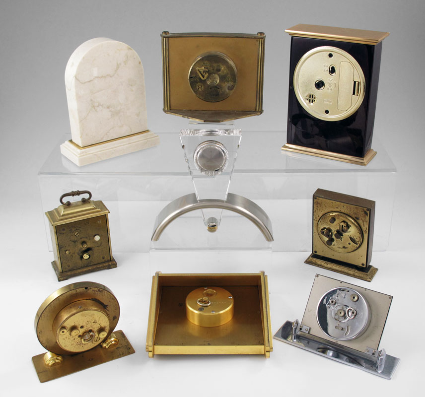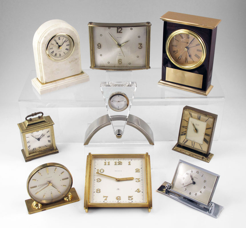 COLLECTION OF 9 TRAVEL & DESK CLOCKS: To include 1) Relid 7 Jewel travel clock, 3 3/4'' h. 2) Benrus desk clock, 2'' h. 3) Bulova carriage clock, 3 7/8'' h. 4) Howard Miller presentation desk clock, quartz movement, 5 3/4'' h. 5) Swiza Coquet travel clock, 3 3/4'' h. 6) F-J Cooper travel clock, 3 1/4''. 7) Kienzle desk clock, 2 5/8'' h. 8) Unmarked marble desk clock with quartz movement, 5 1/2'' h. 9) Unmarked glass and chrome desk clock with quartz movement, 4 1/2'' h.