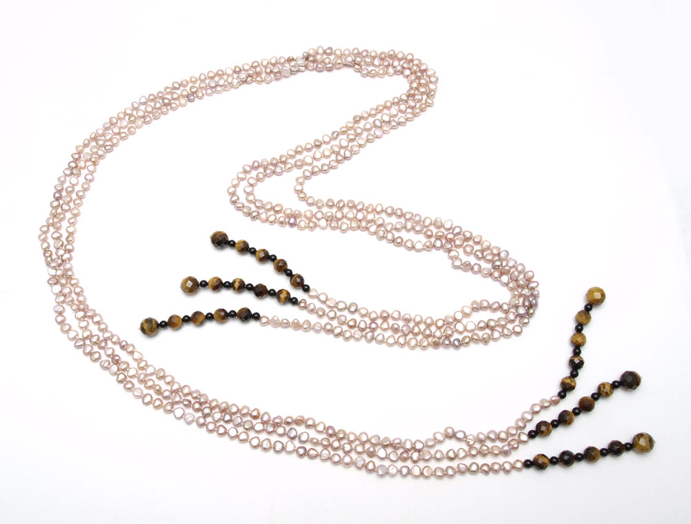 48'' PEARL & TIGER EYE QUARTZ BELT / NECKLACE: 3 strands of 5.50 mm fresh water pearls, pink- peach in color. The ends are strung with smooth and faceted tiger eye quartz beads. Overall length: 48''