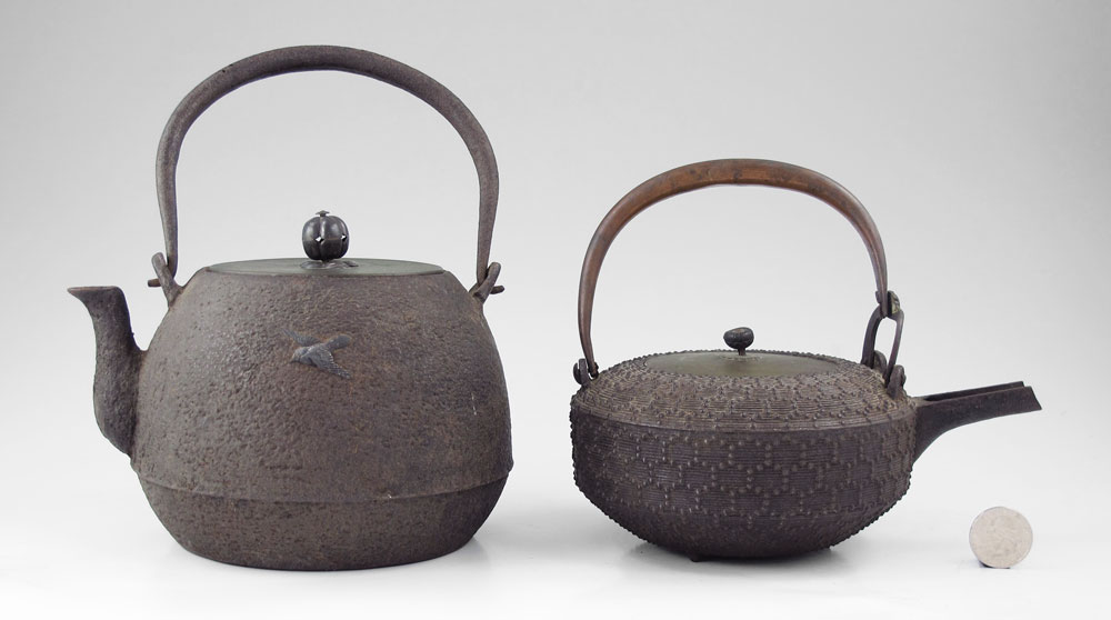 2 JAPANESE CAST IRON TEAPOTS: To include 1) Teapot with lid, bamboo motif on side. Articulated handle, unmarked. 8 1/2'' h. x 7 1/4''. 2) Squat teapot with lid, geometric pattern. Articulated handle, unmarked. 4 1/4'' h. x 7 1/2''.