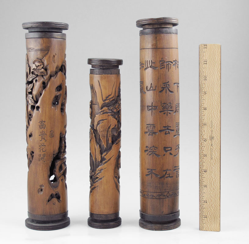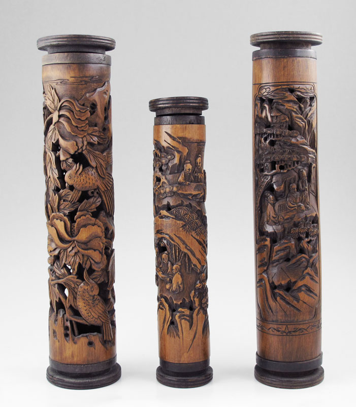 3 PIECE DECORATIVE CHINESE CARVED CRICKET CAGES: Carved and pierced with oriental motifs and mottos. Largest measures 13 3/4'' h. x 3'' dia.