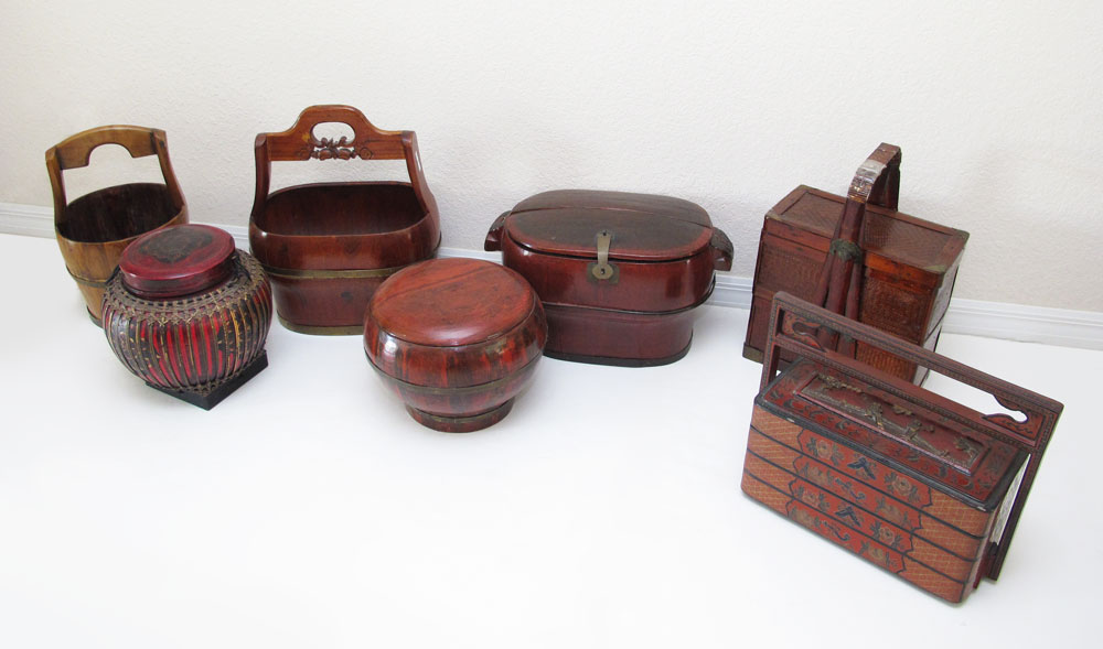 7 CHINESE BASKETS AND CONTAINERS: Good examples of wood, lacquer, and woven baskets to include two stacking baskets, metal mounted wood baskets, and covered vessels. The largest measures 19'' tall overall x 15'' wide. Sold as a lot.