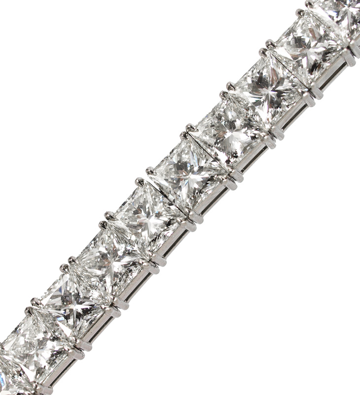 PLATINUM 17.60 CTW DIAMOND LINE BRACELET: The bracelet you have been waiting for. Platinum with 44 princess cut diamonds all totaling approx. 17.60 Ct. Averaging 4x4 mm., and rated VVS-VS in clarity and G-H in color. Each diamond has a laser inscription on the girdle. Locking closure with hidden hinged safety clasp. Length: 7.25''. Weight: 29.2 grams. Sold with current Florida Diamond Appraisers GIA graduates appraisal for $89,750.