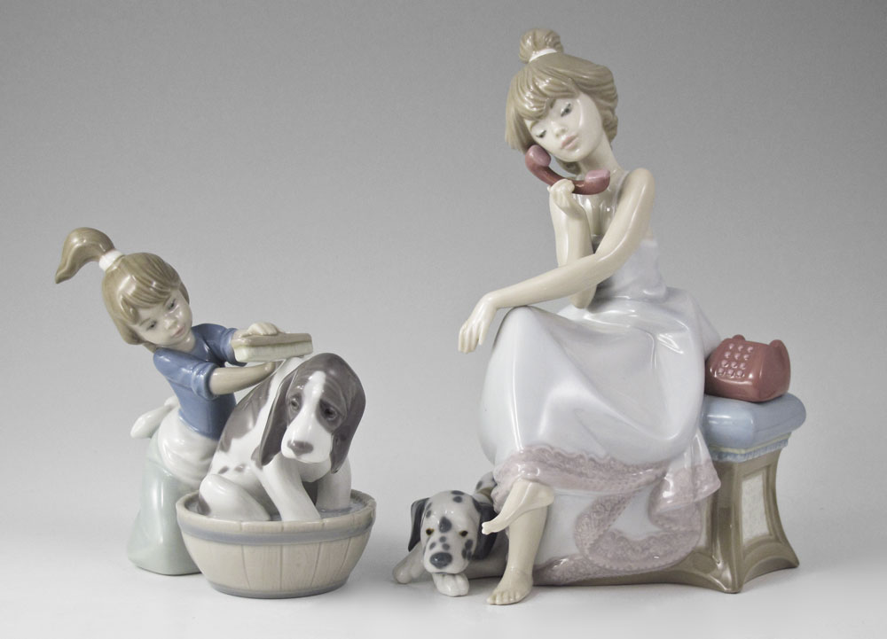 2 LLADRO PORCELAIN FIGURINES BY JUAN HUERTA: 1) CHIT-CHAT #5466, issued 1988 retired 1991, blue dress, 7 3/4'' x 4 3/4''; 2) BASHFUL BATHER #5455, glazed finish, issued 1988, 4 3/4'' x 5 1/2'' x 3''.