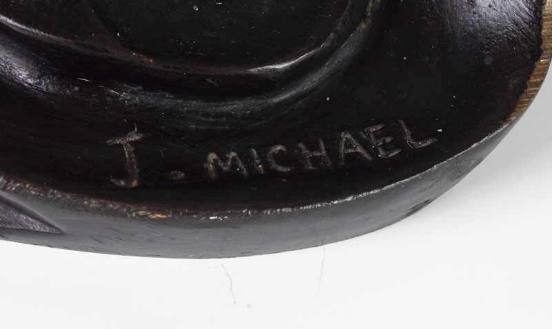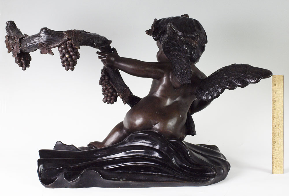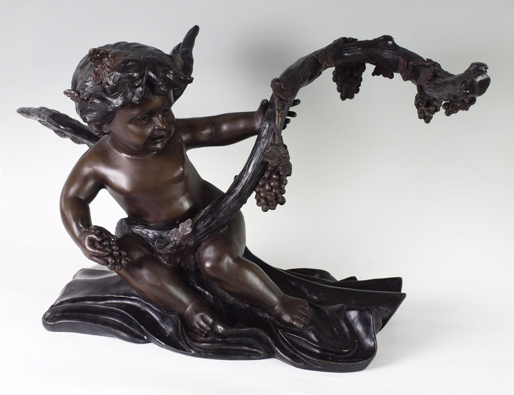 BRONZE CHERUB SCULPTURE SIGNED J. MICHAEL, TABLE BASE: Contemporary bronze sculpture of a cherub with a branch. 19'' h. x 33'' x 15''.