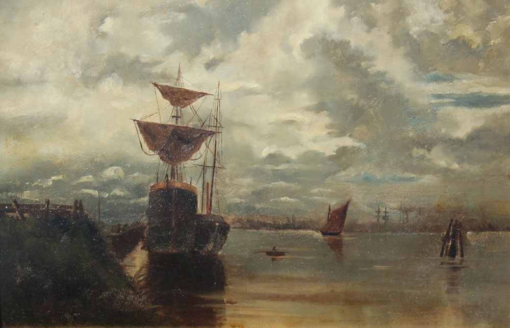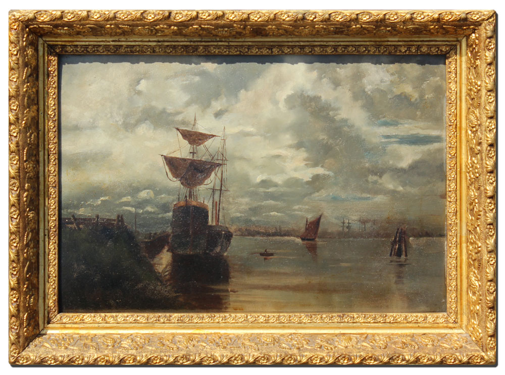 19TH CENTURY AMERICAN SCHOOL HARBOR PAINTING: Oil/Board, 12 1/2'' x 18 1/2'', no visible signature, encased in period gilded gesso frame w/wear, 16 1/2'' x 22 1/2''.