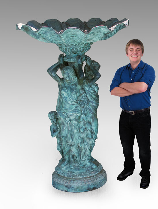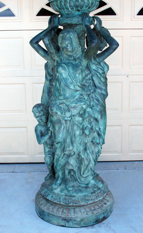 7 FT TALL BRONZE 3 GRACES FIGURAL FOUNTAIN: Patinated bronze with life size 3 Graces and putti. Plumbing has recently been serviced. Measures approx. 83'' h. x 54'' top dia. Please see similar, but not identical, fountain next lot.