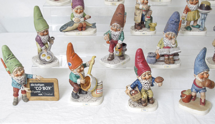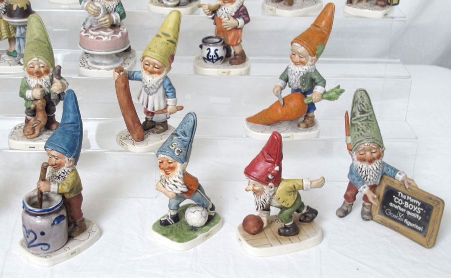 LOT OF 26 CO-BOY FIGURINES BY GOEBEL: To include, two sign holders - one in German, one in English (small chip on tip of pencil), Petri, Fips, Porz, Jack, Tom, Kuni, Bob, Mark, Max, Mike, John (note broken gun), Utz, Candy, Sepp, Wim, Bert, Jim, Ed, Sam, Robby, Fritz, Conny and a couple of more.