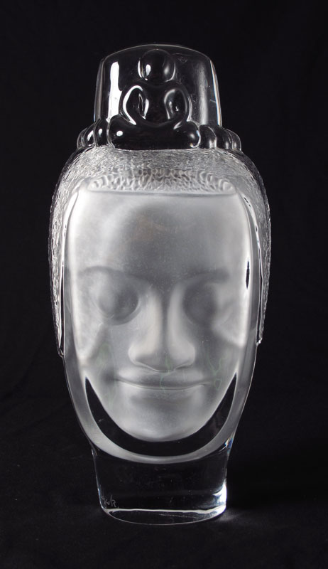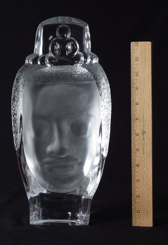 DAUM CRYSTAL BUDDHA BOUDDHA: Limited Edition 200/300, designed by Roy Adzak, issued 1977, signed lower left, edition number and Daum mark lower right. With box and card. Head measures 13 1/2''h. x 6 3/4'' x 2 7/8'', box measures 20'' x 9 3/4'' x 3''.