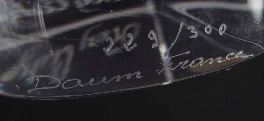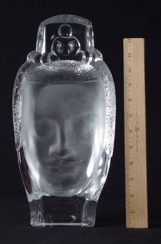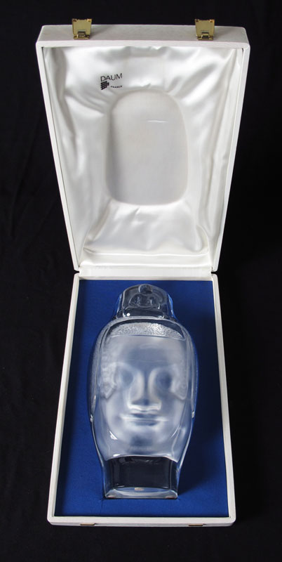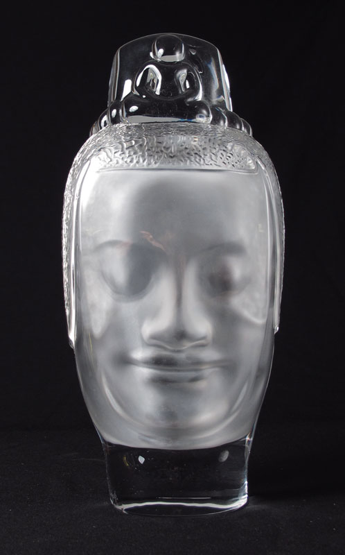 DAUM CRYSTAL BUDDHA BOUDDHA: Limited Edition 229/300, designed by Roy Adzak, issued 1977, signed lower left, edition number and Daum mark lower right, with box. Head measures 13 1/2''h. x 6 3/4'' x 2 7/8'', box measures 16'' x 9 3/4'' x 3''.