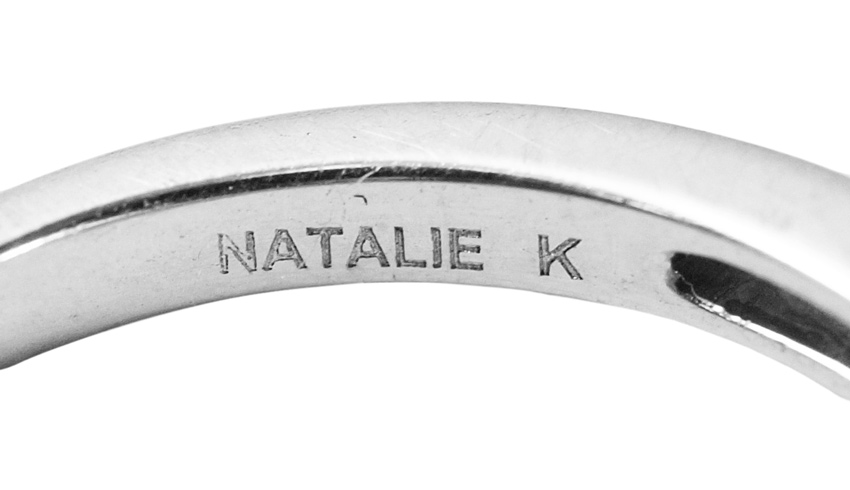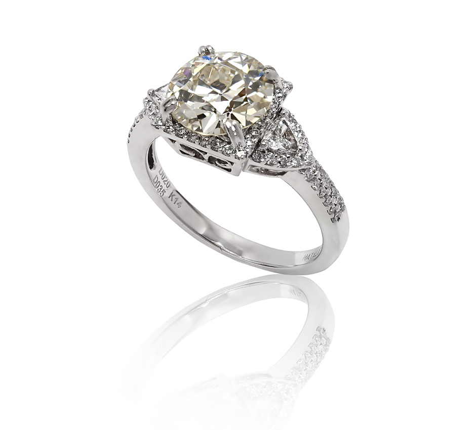 2.52 CT DIAMOND SOLITAIRE RING BY NATALIE K: 14k white gold ring centers an approx. 2.52 Ct. round brilliant cut diamond of VS1 clarity and M color. At the sides are 2 triangle cut diamonds. The three larger diamonds are framed by 70 round brilliant cut diamonds, VS in clarity and G-H color. TOTAL Diamond weight 3.07 Ct. Size 8. Weight 4.8 grams. Signed Natalie K. Sold with current Atlanta Gemological GIA graduates appraisal for $24,650.