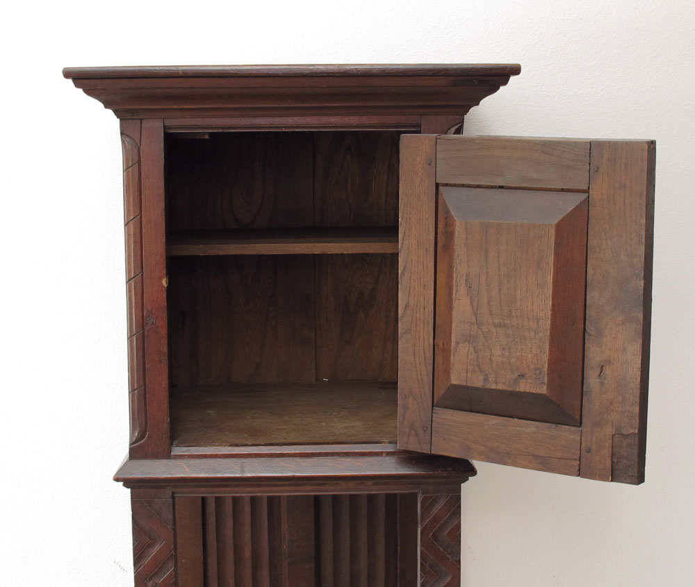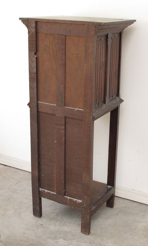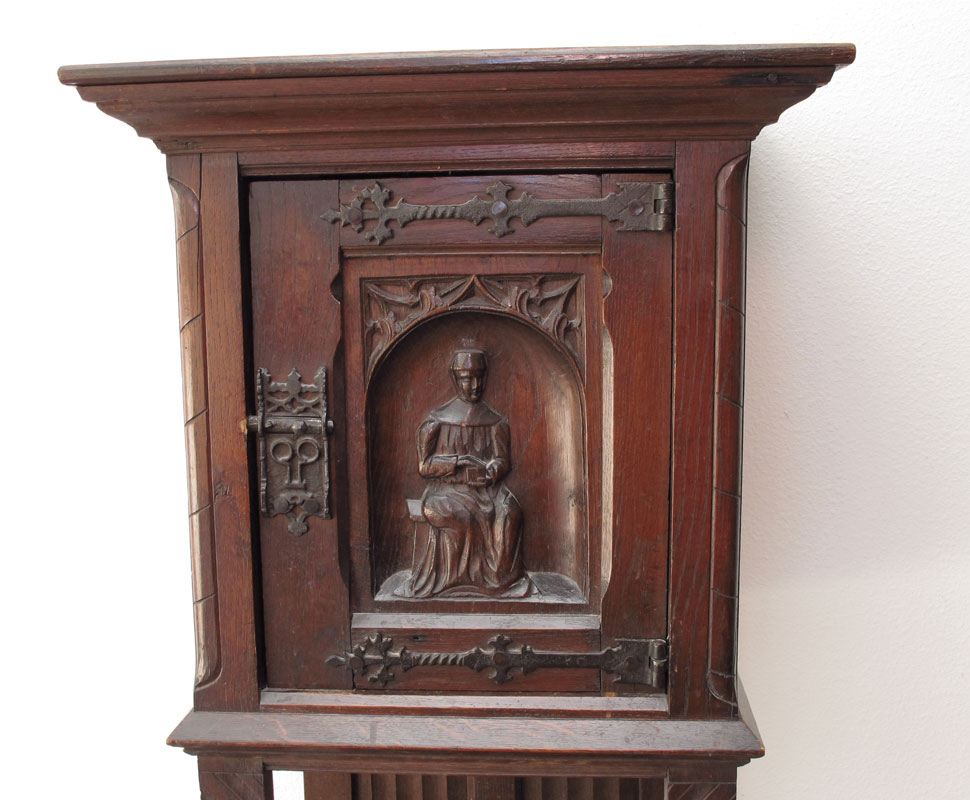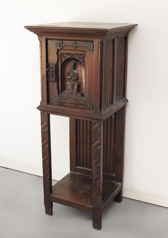 JACOBEAN STYLE CARVED PEDESTAL CABINET: Late 19th century, figural carved door of nun with box, iron hardware. Carved sides to top section, carved front legs. Open lower shelf. 49 1/2'' h. x 21'' x 17 3/4''.