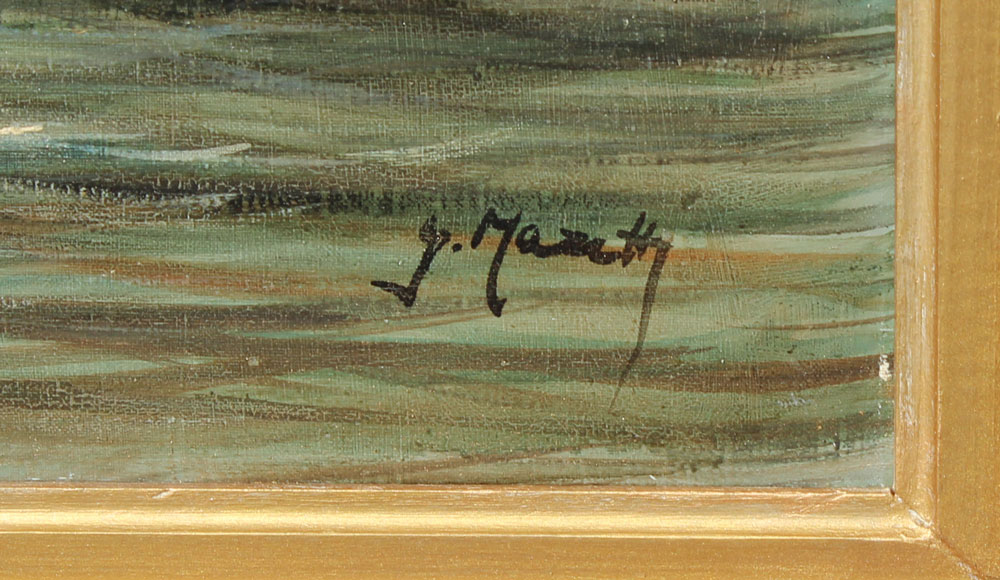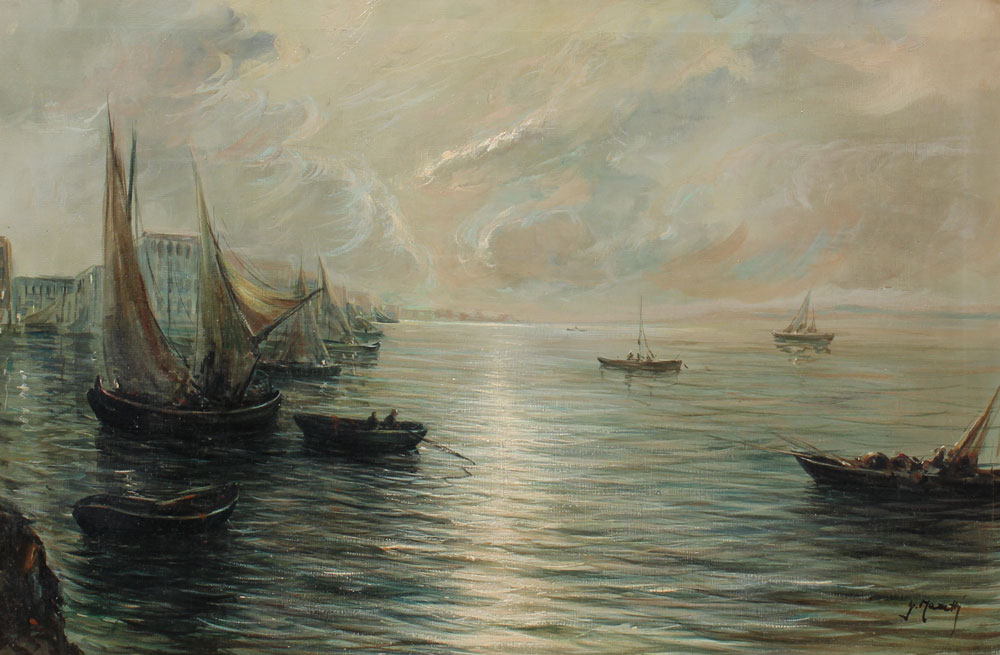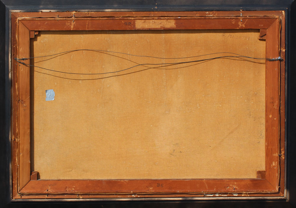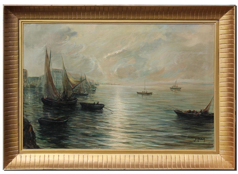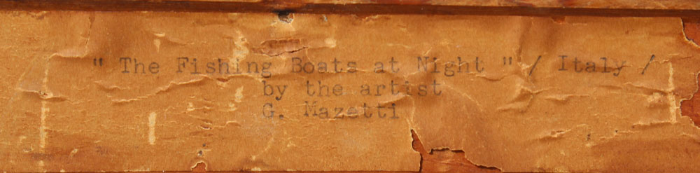 MAZETTI, G., (Italian, 20th Century): ''The Fishing Boats at Night, Italy'', Grand Canal Venice Scene, Oil/canvas, 24'' x 36'', signed lower right, gilded gold frame, 30 1/2'' x 42'', original label affixed verso, small patch visible verso.