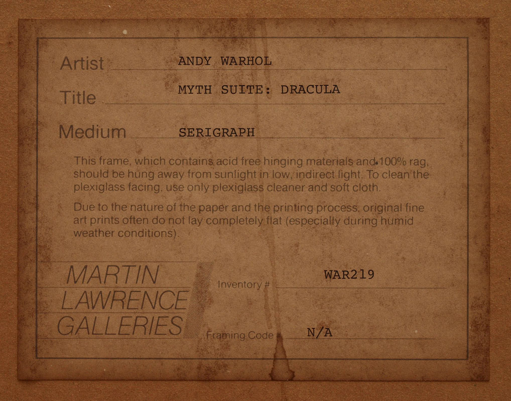 WARHOL, Andy, (American 1928-1987): ''Dracula, From the Myth Suite'', Serigraph, 38'' x 38'', signed lower right, #'d 15/200, encased in custom plexiglass frame, original Martin Lawrence Gallery Label affixed verso. From the estate collection of local animal philanthropist Tony Witlin, son of renowned artist Roy Witlin. Purchased directly from Martin Lawrence Gallery in New York City.