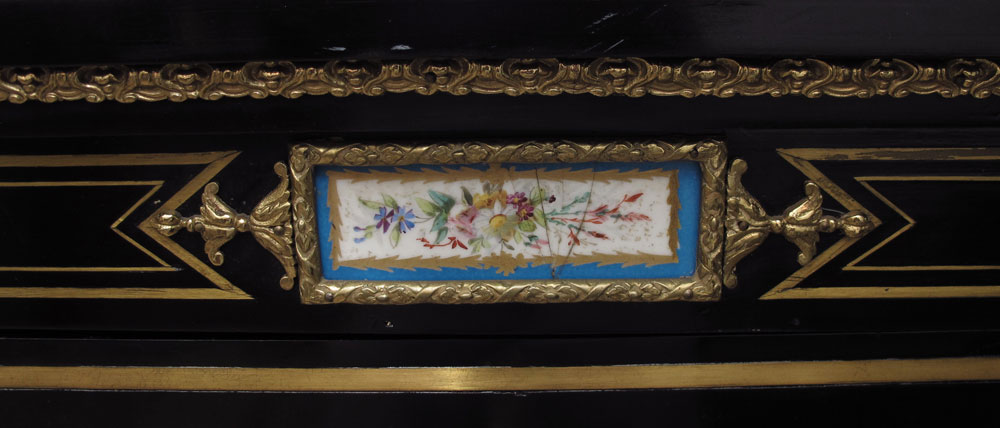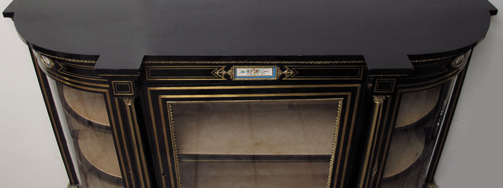 FRENCH ORMOLU AND BOULLE INLAY SIDE CABINET: Glass front and curved side doors. Boulle inlay frames each of the doors and follows the lines of the cabinet. Ormolu framed hand painted porcelain plaques. Fabric lined and covered interior, reeded stiles. Turnip feet. Key locking, key included. Approx. 44''h. x 68 1/2'' long x 18''.