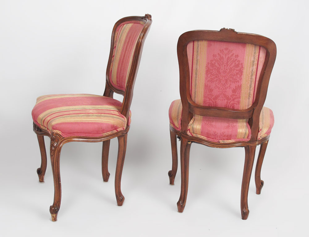 SET OF 4 FRENCH STYLE SIDE CHAIRS: Molded walnut frames with carvings at the crest and skirt, cabriole legs ending in French feet. Measures approx. 35'' tall x 19'' x 18''.