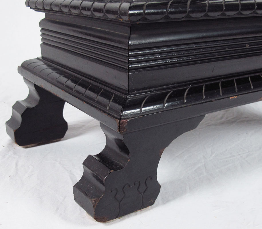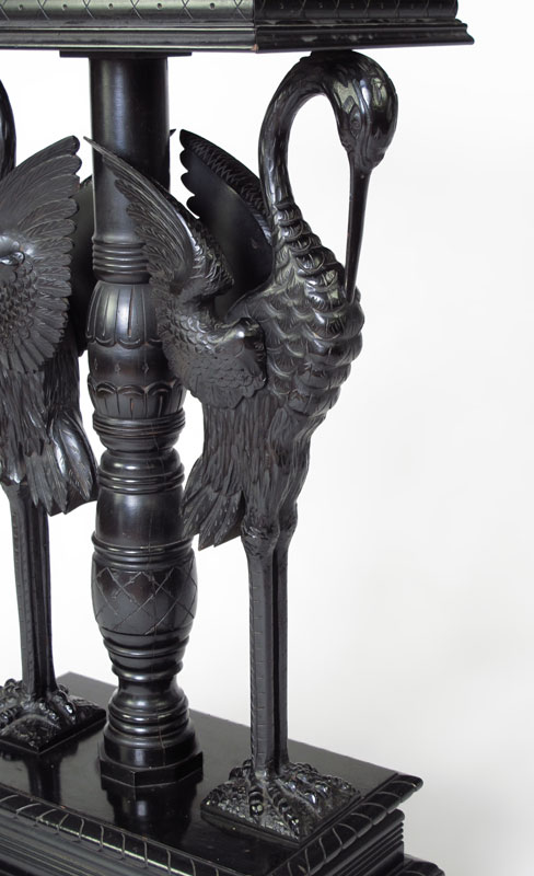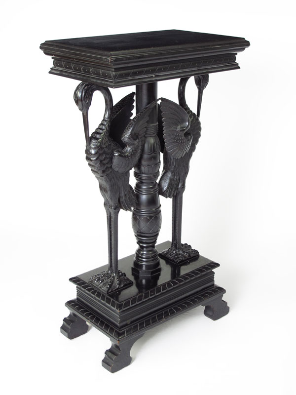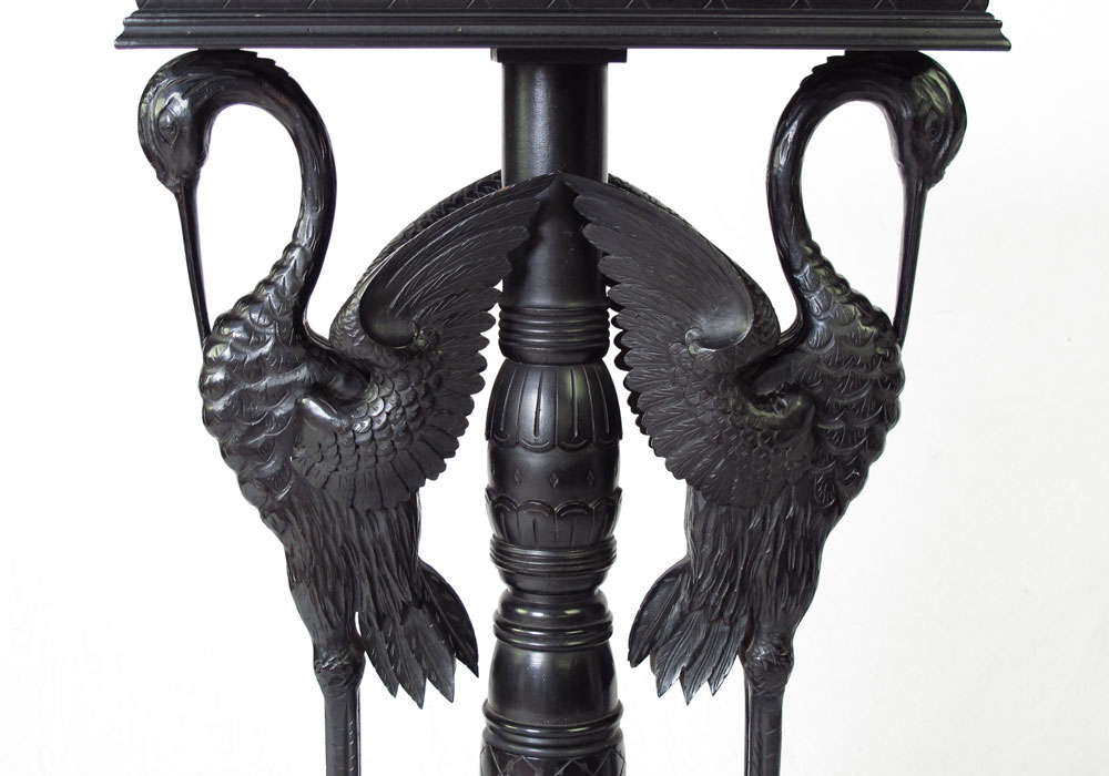 EBONIZED AESTHETIC MOVEMENT FIGURAL PEDESTAL TABLE: 2 Carved figural storks with carved and turned center column. Base on 4 shaped feet. 37'' h. x 20 1/4'' x 13''.