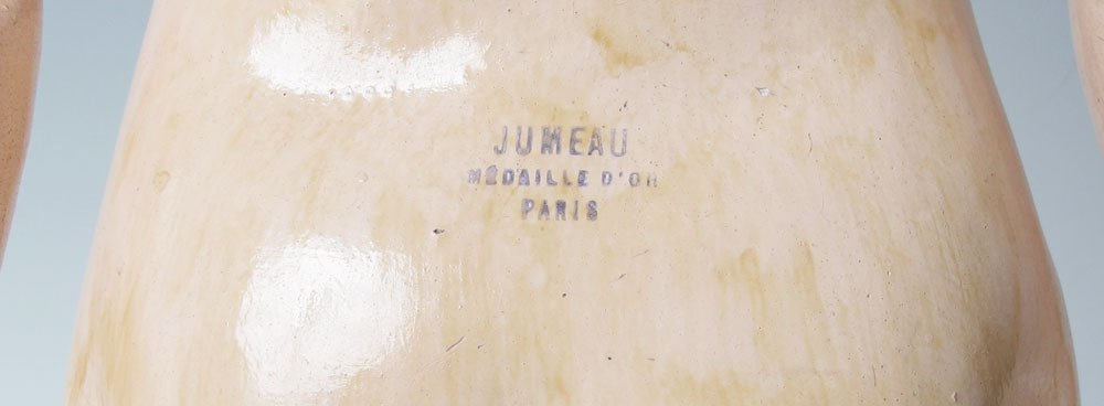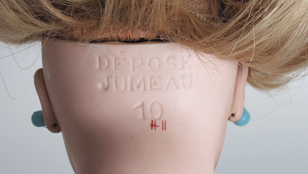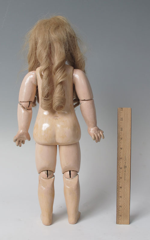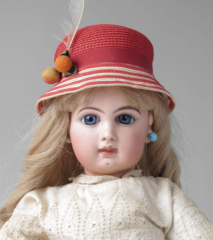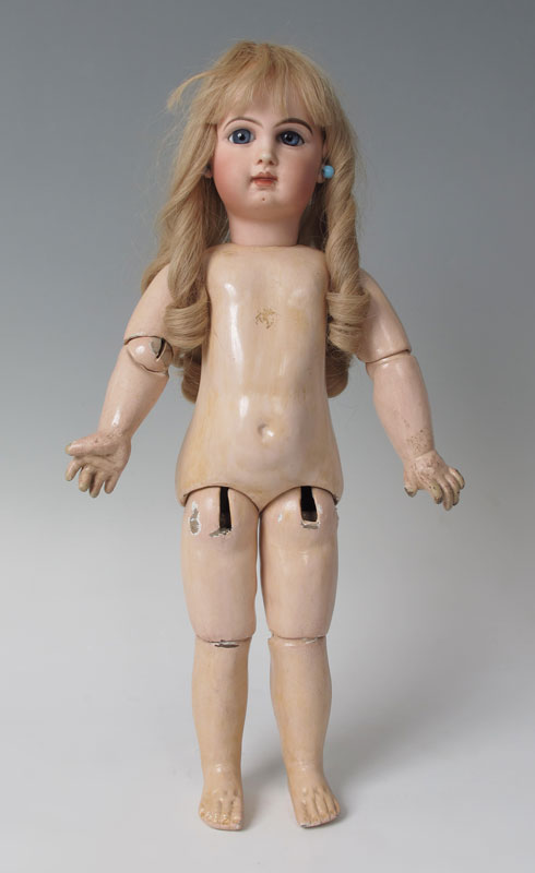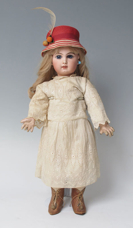 FRENCH JUMEAU CLOSE MOUTH DOLL: ''Depose Jumeau 10'' impressed on the back of her bisque head. Closed mouth, fixed blue glass eyes, pierced ears, dimple chin, painted eyebrows and lashes. Jointed composition body and limbs, un-jointed wrists. Discolored eyelet dress and slip. Approx. 22'' length.