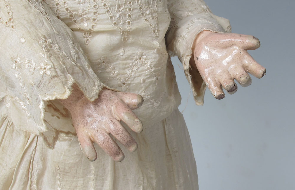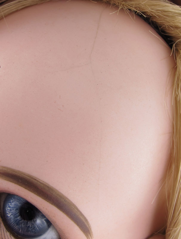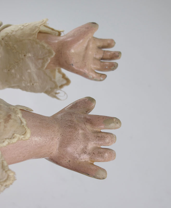 CONDITION: There is a slight hairline behind her bangs. Her dress is starting to wear. The composition body shows wear, especially on the hands.